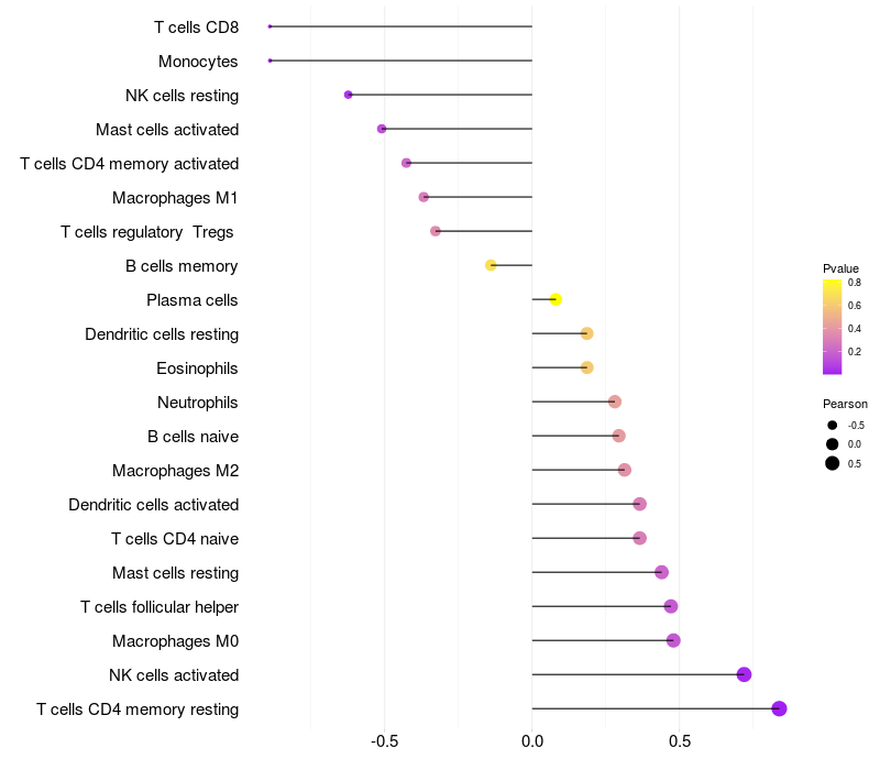 Lollipop of CLCC1 expression and immune infiltrating cell level correlation result in HBV+ Chronic HBV (CHB) infection samples