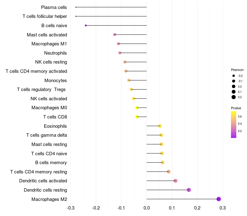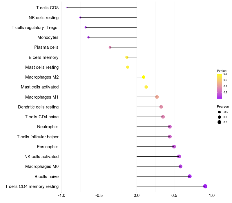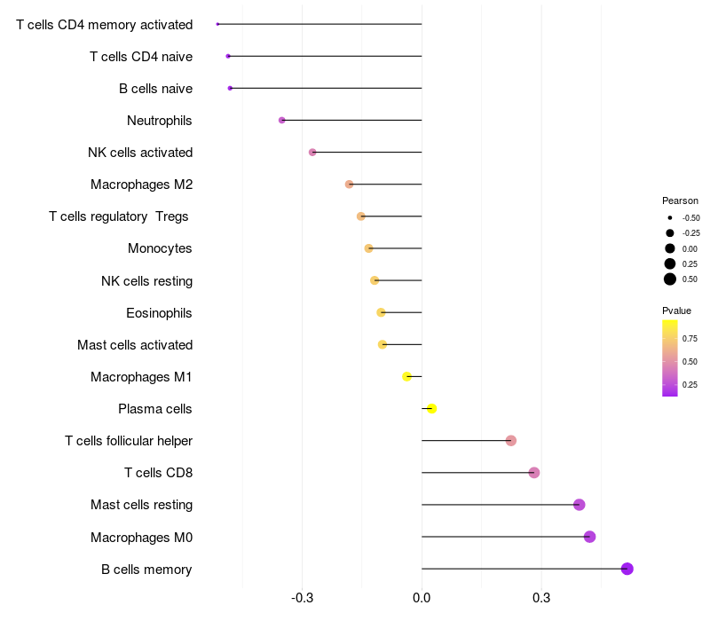 Lollipop of CLCC1 expression and immune infiltrating cell level correlation result in HBV+ Liver cirrhosis samples