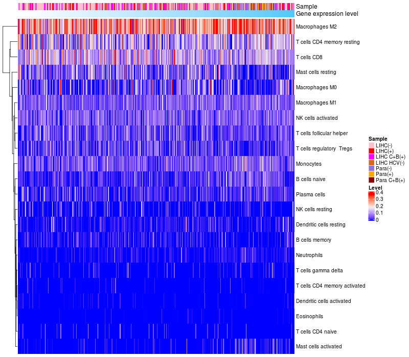 Liver hepatocellular carcinoma HCV (HBV+)(86), Liver hepatocellular carcinoma HCV (HBV-)(19), Liver hepatocellular carcinoma (HBV+)(209), Liver hepatocellular carcinoma (HBV+)(60), Paracancerous HCV (HBV+)(4), Paracancerous (HBV-)(28), Paracancerous (HBV+)(18) |