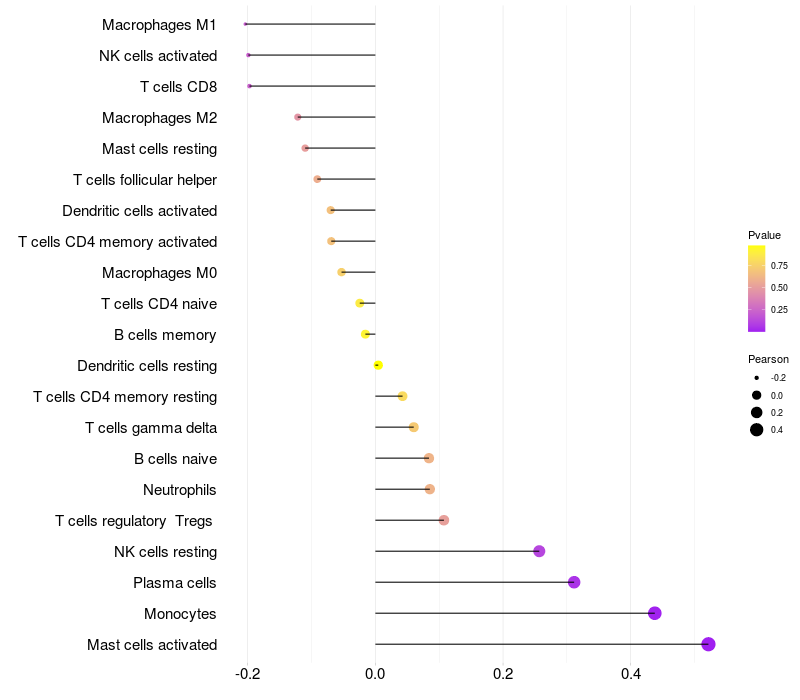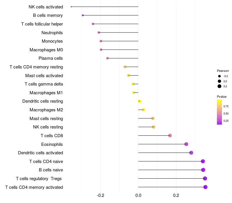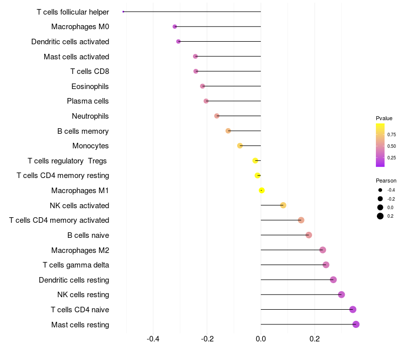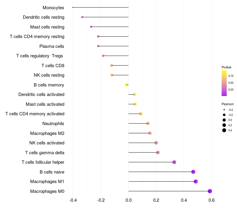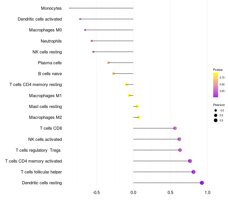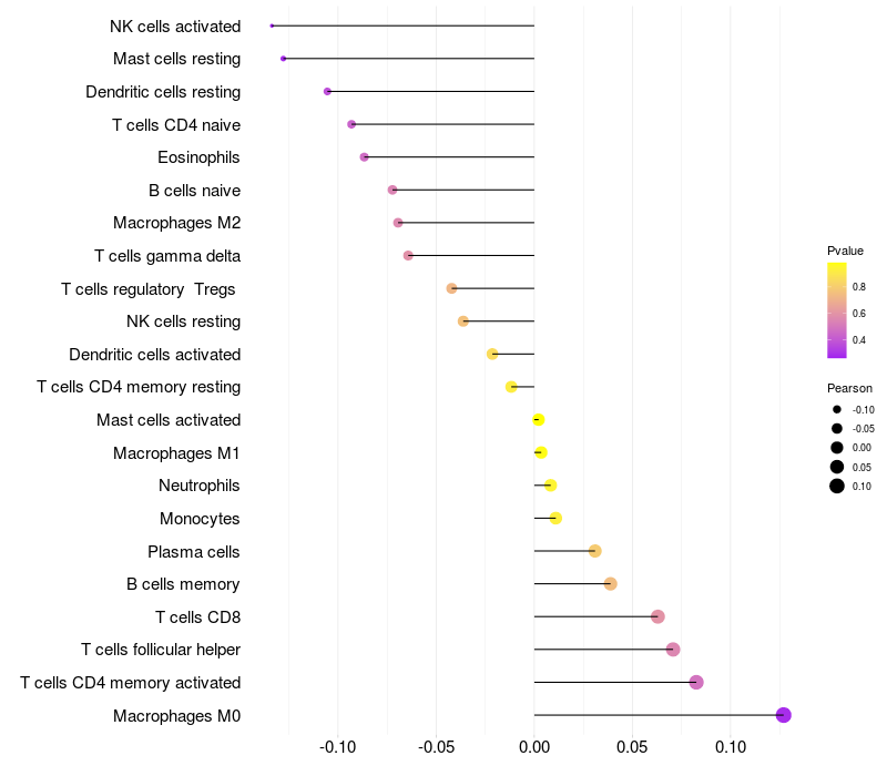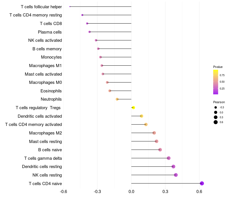 Lollipop of CLDN18 expression and immune infiltrating cell level correlation result in HPV+ samples