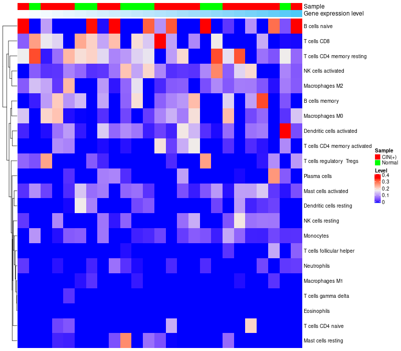 • Left: Heatmap of target gene expression and the level of various types of immune cells (cell type fractions) in all samples based on CIBERSORT method.