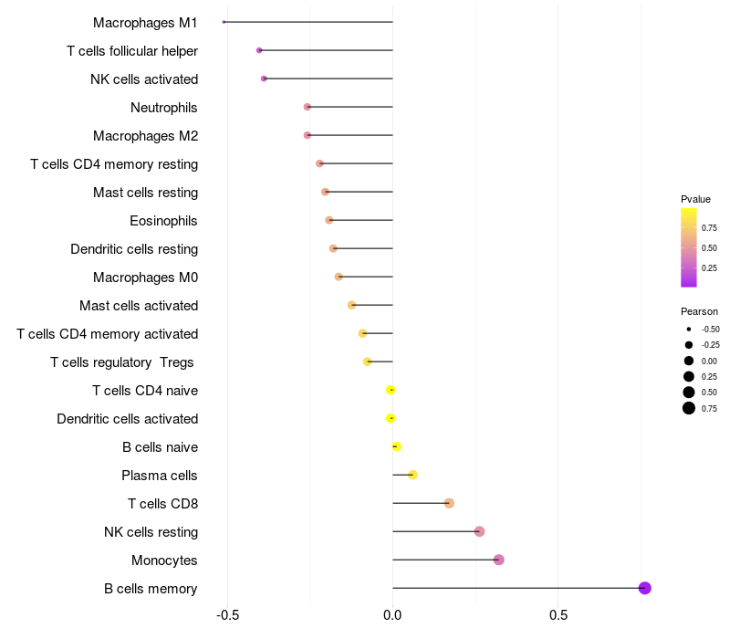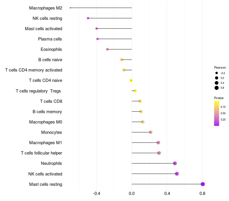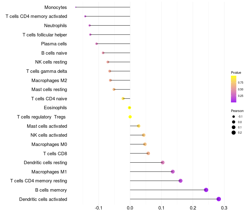 Lollipop of CLK4 expression and immune infiltrating cell level correlation result in HBV+ Chronic HBV (CHB) infection samples