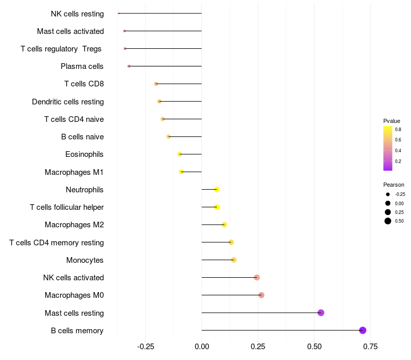 Lollipop of CLK4 expression and immune infiltrating cell level correlation result in HBV+ samples