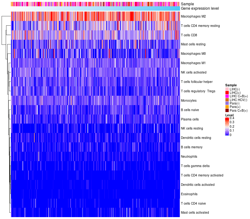 Liver hepatocellular carcinoma HCV (HBV+)(86), Liver hepatocellular carcinoma HCV (HBV-)(19), Liver hepatocellular carcinoma (HBV+)(209), Liver hepatocellular carcinoma (HBV+)(60), Paracancerous HCV (HBV+)(4), Paracancerous (HBV-)(28), Paracancerous (HBV+)(18) |