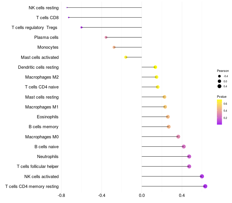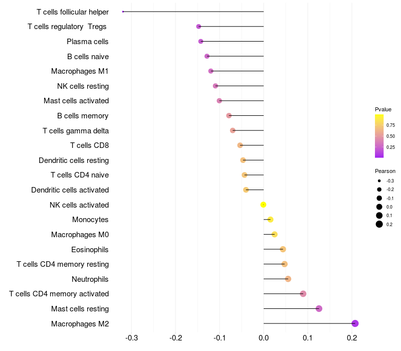 Lollipop of CLOCK expression and immune infiltrating cell level correlation result in HBV+ Liver cirrhosis samples