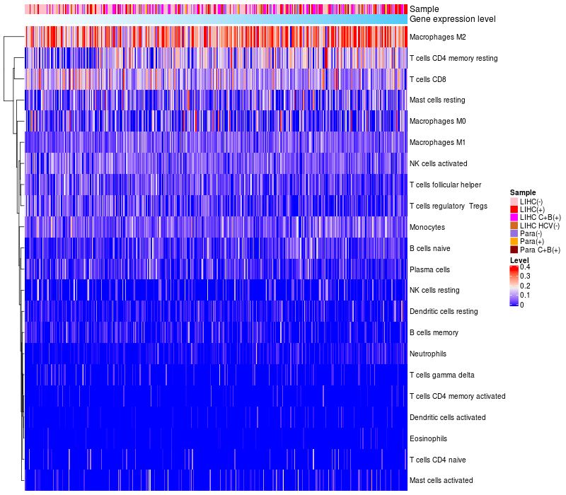 Liver hepatocellular carcinoma HCV (HBV+)(86), Liver hepatocellular carcinoma HCV (HBV-)(19), Liver hepatocellular carcinoma (HBV+)(209), Liver hepatocellular carcinoma (HBV+)(60), Paracancerous HCV (HBV+)(4), Paracancerous (HBV-)(28), Paracancerous (HBV+)(18) |