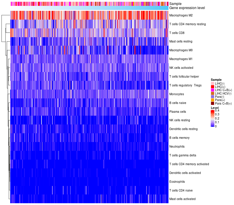 Liver hepatocellular carcinoma HCV (HBV+)(86), Liver hepatocellular carcinoma HCV (HBV-)(19), Liver hepatocellular carcinoma (HBV+)(209), Liver hepatocellular carcinoma (HBV+)(60), Paracancerous HCV (HBV+)(4), Paracancerous (HBV-)(28), Paracancerous (HBV+)(18) |