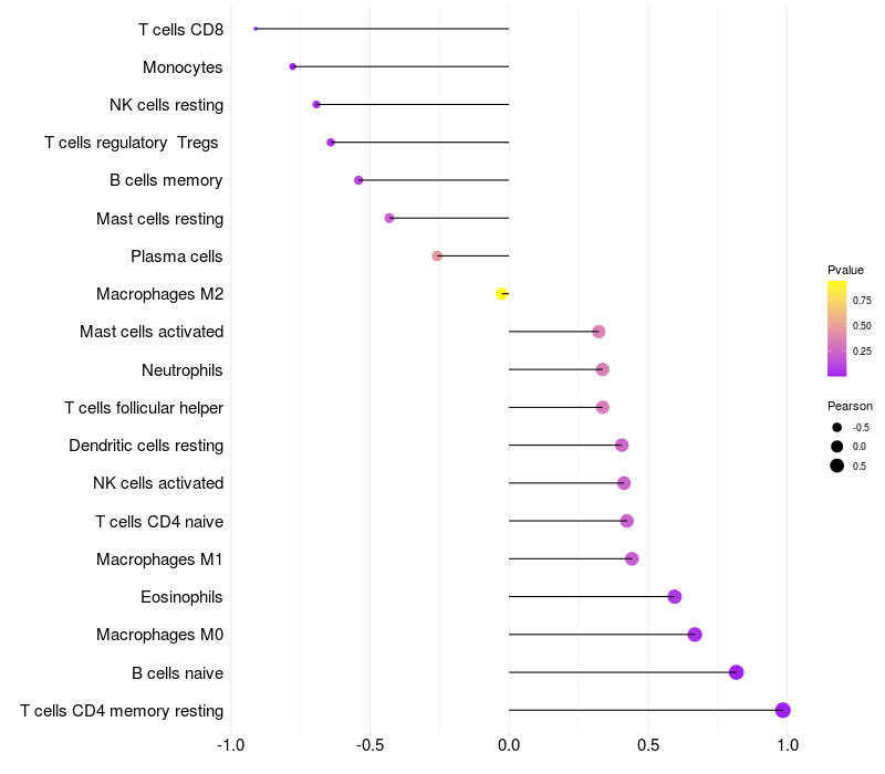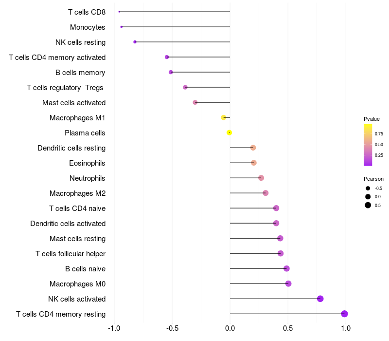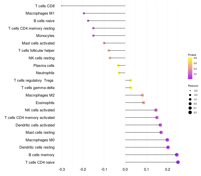 Lollipop of COLEC12 expression and immune infiltrating cell level correlation result in HBV+ Chronic HBV (CHB) infection samples
