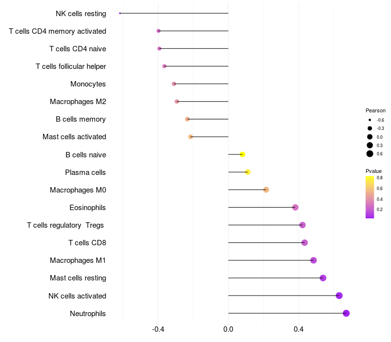 Lollipop of COLEC12 expression and immune infiltrating cell level correlation result in HBV+ Liver cirrhosis samples