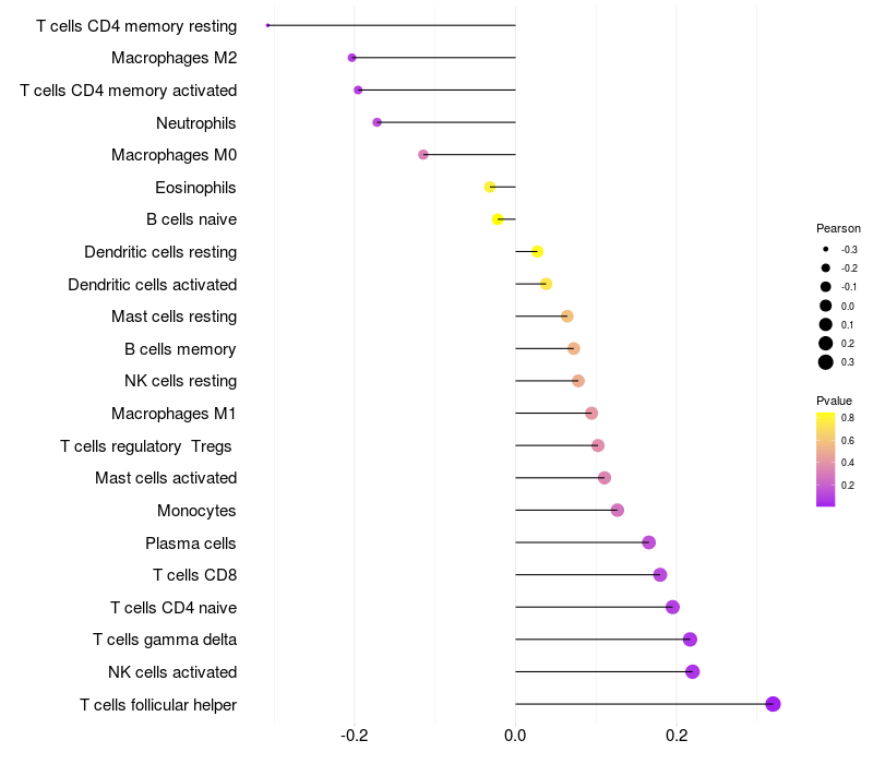 Lollipop of COMMD1 expression and immune infiltrating cell level correlation result in HBV+ Chronic HBV (CHB) infection samples