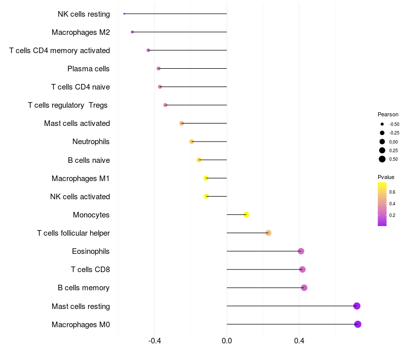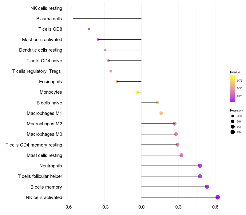 Lollipop of COMMD10 expression and immune infiltrating cell level correlation result in HBV+ Liver cirrhosis samples