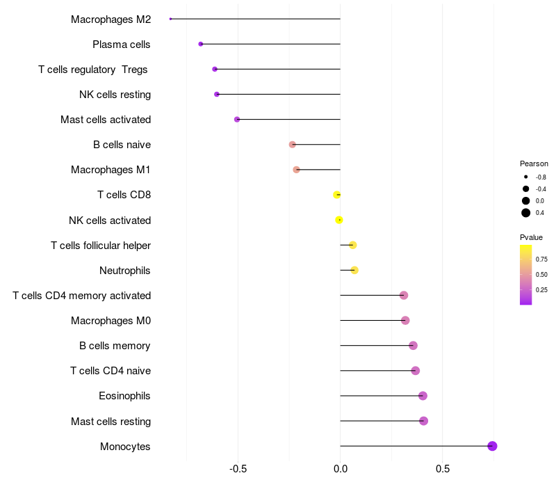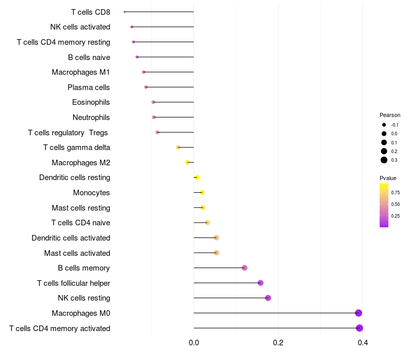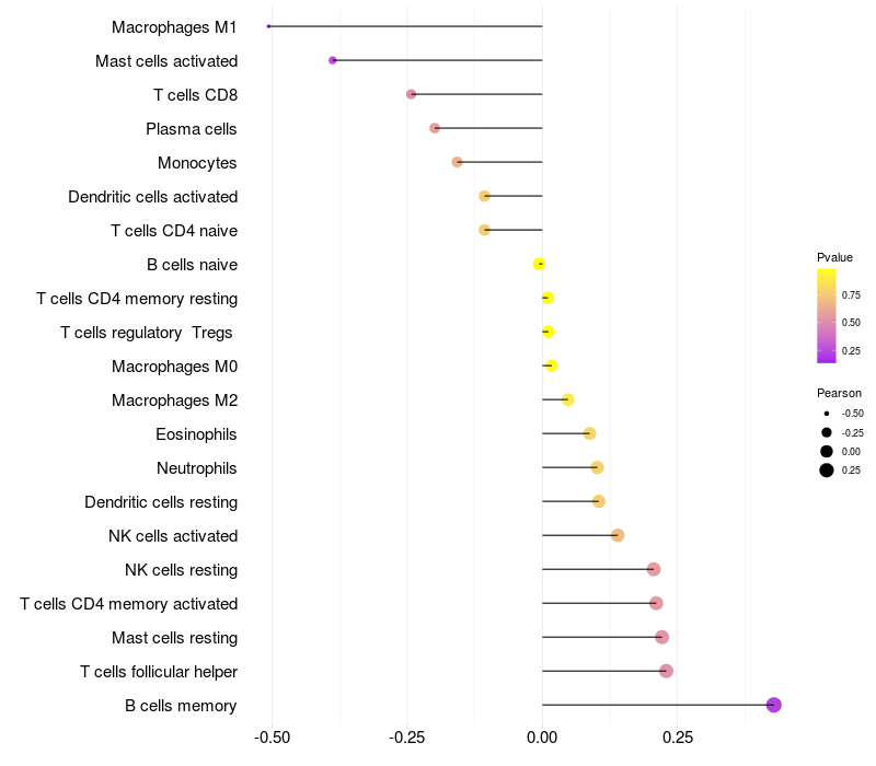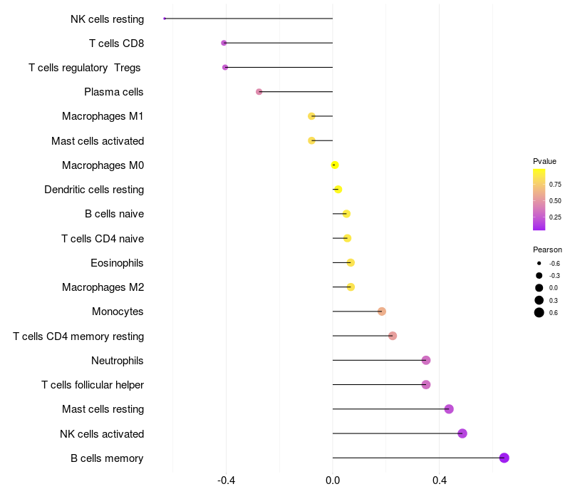 Lollipop of COPS3 expression and immune infiltrating cell level correlation result in HBV+ Liver cirrhosis samples