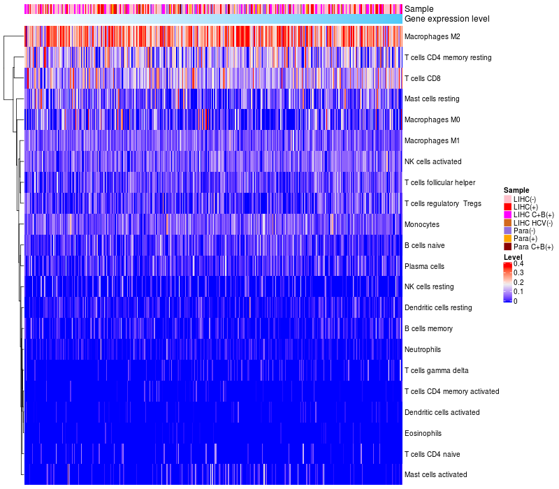 Liver hepatocellular carcinoma HCV (HBV+)(86), Liver hepatocellular carcinoma HCV (HBV-)(19), Liver hepatocellular carcinoma (HBV+)(209), Liver hepatocellular carcinoma (HBV+)(60), Paracancerous HCV (HBV+)(4), Paracancerous (HBV-)(28), Paracancerous (HBV+)(18) |