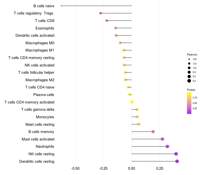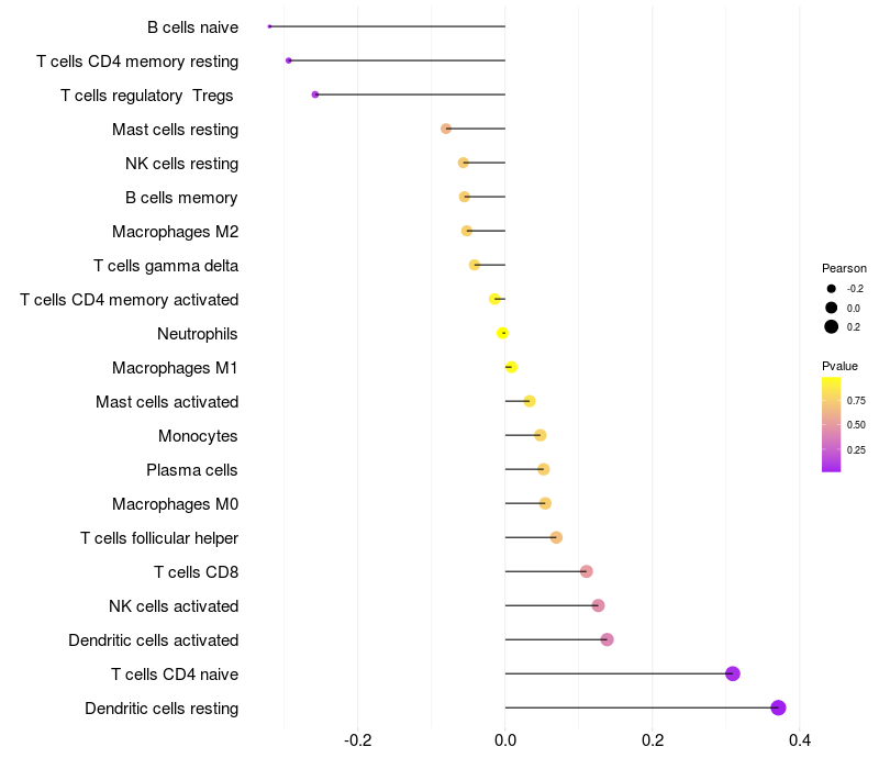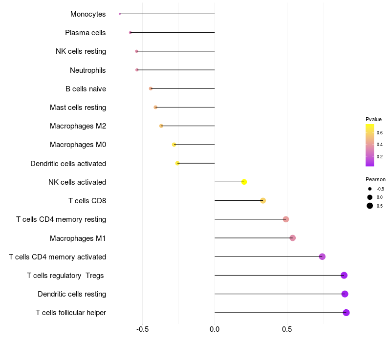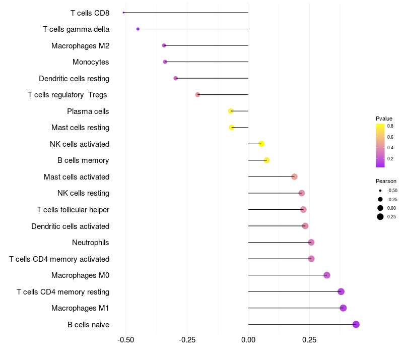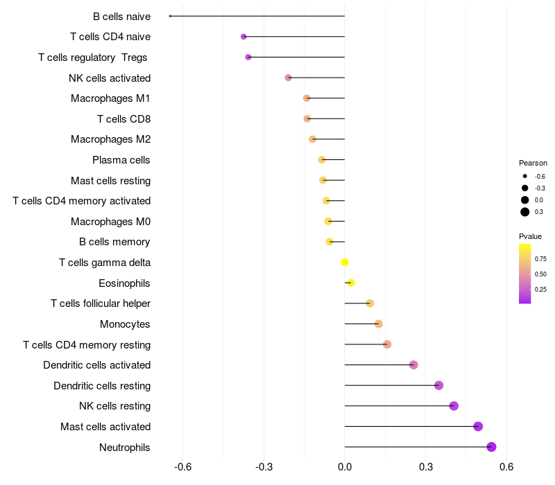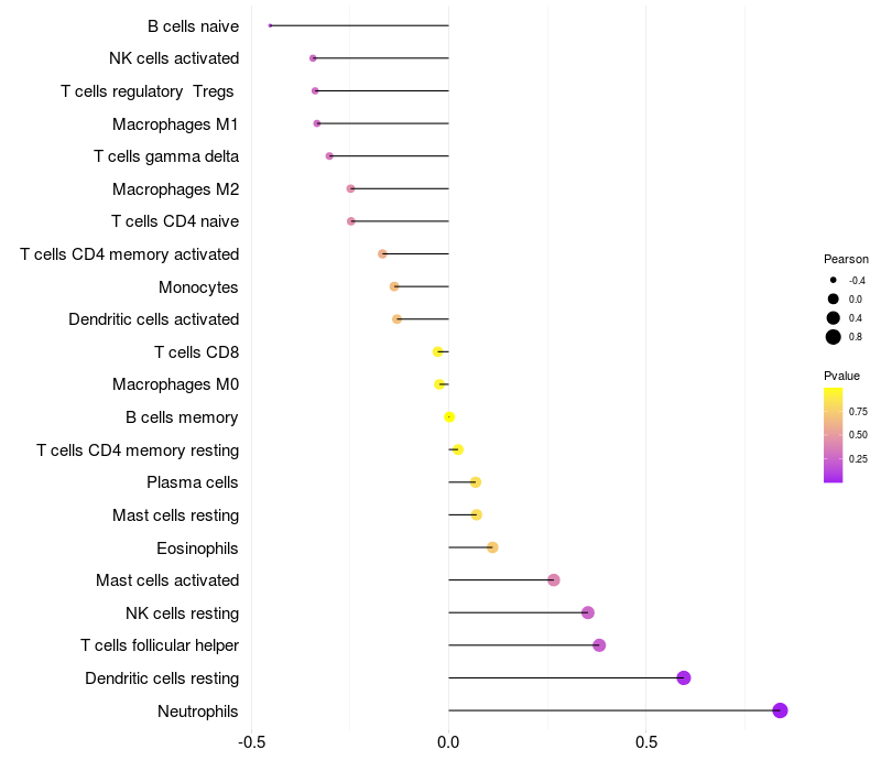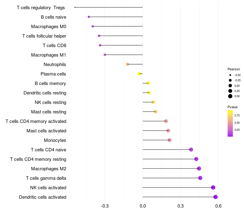 Lollipop of COPS5 expression and immune infiltrating cell level correlation result in HPV+ samples