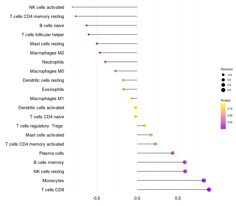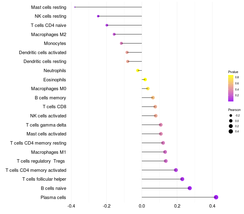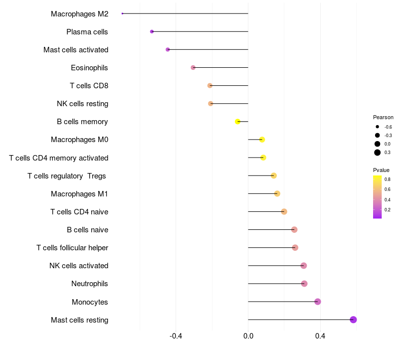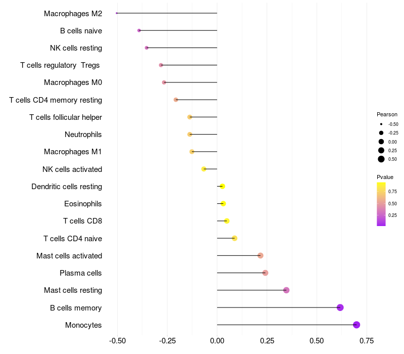 Lollipop of COTL1 expression and immune infiltrating cell level correlation result in HBV+ Liver cirrhosis samples