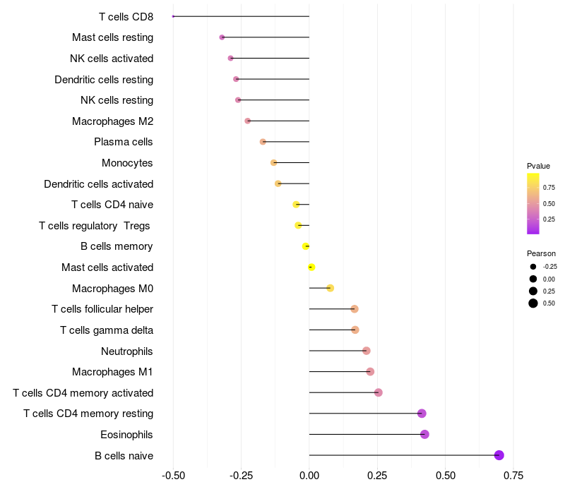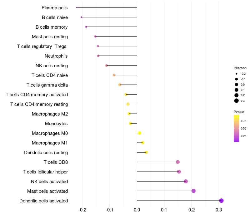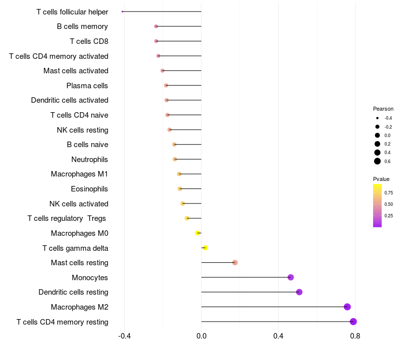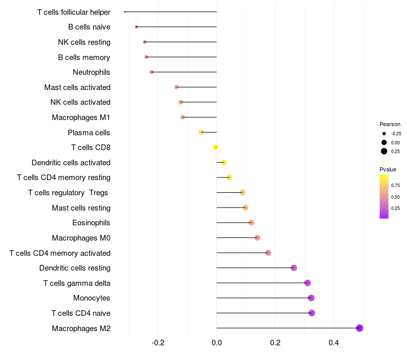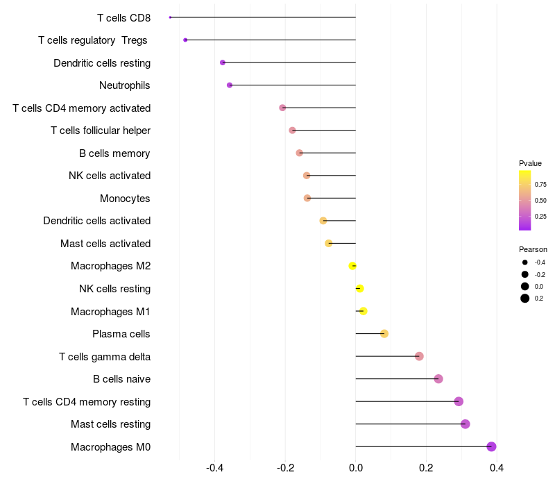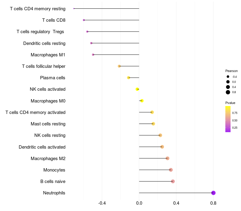 Lollipop of CPXCR1 expression and immune infiltrating cell level correlation result in HPV+ samples