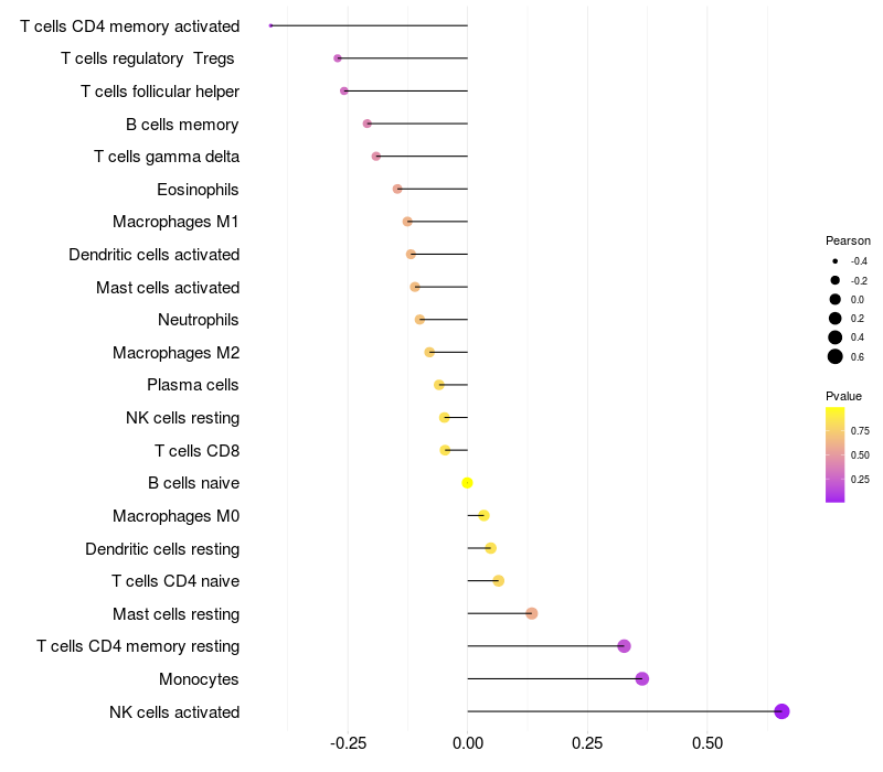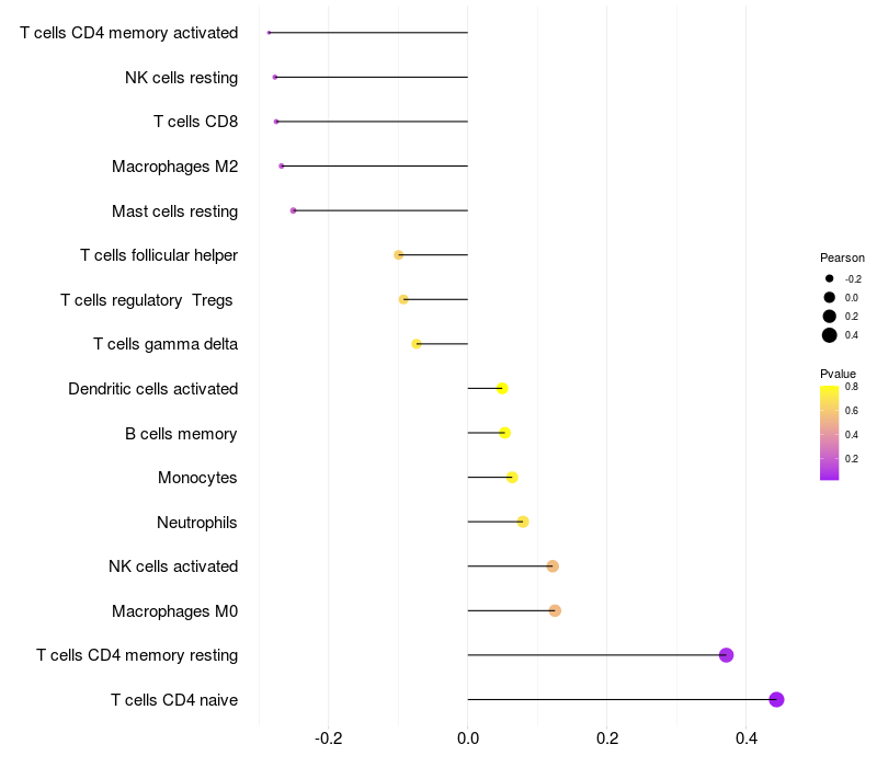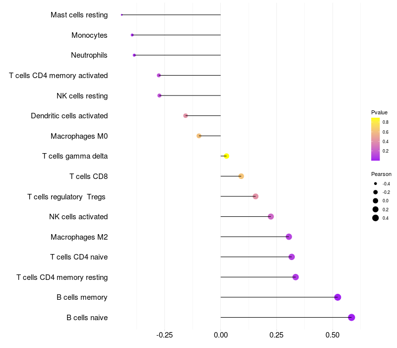 Lollipop of CR2 expression and immune infiltrating cell level correlation result in HTLV1+ samples