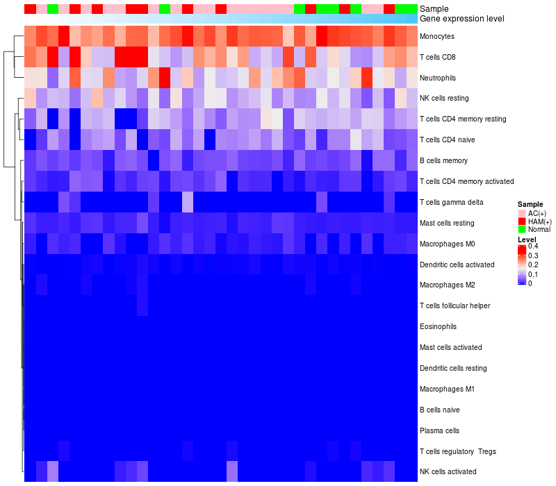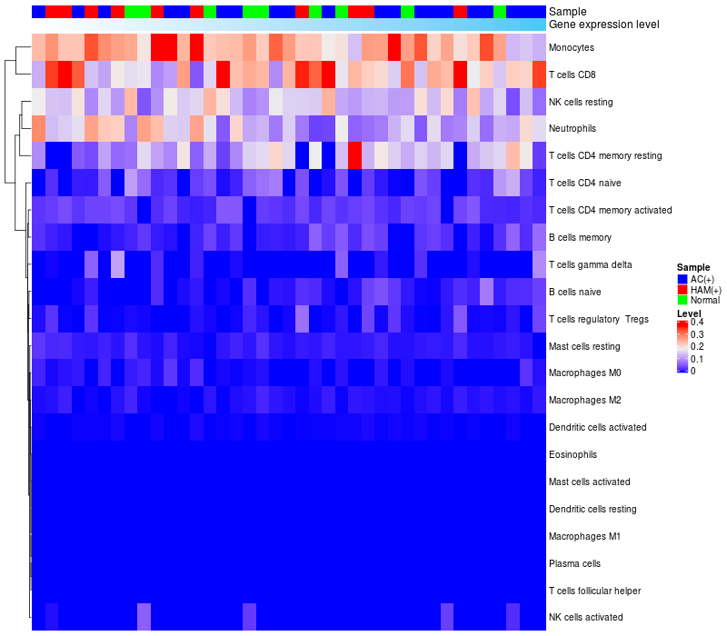 Normal (8), Asymptomatic carriers (HTLV1+)(17), HTLV-1-associated myelopathy (HTLV1+)(10) |