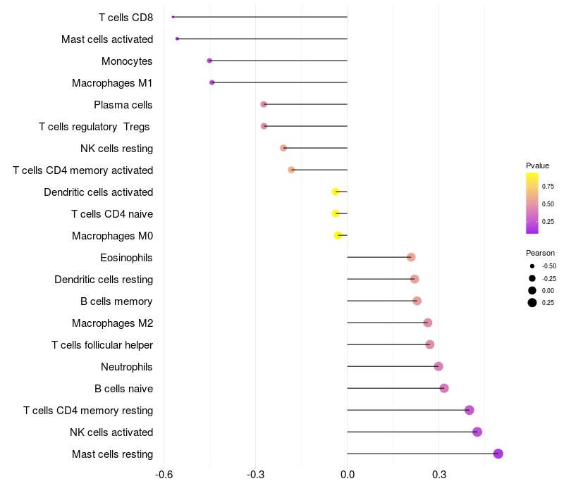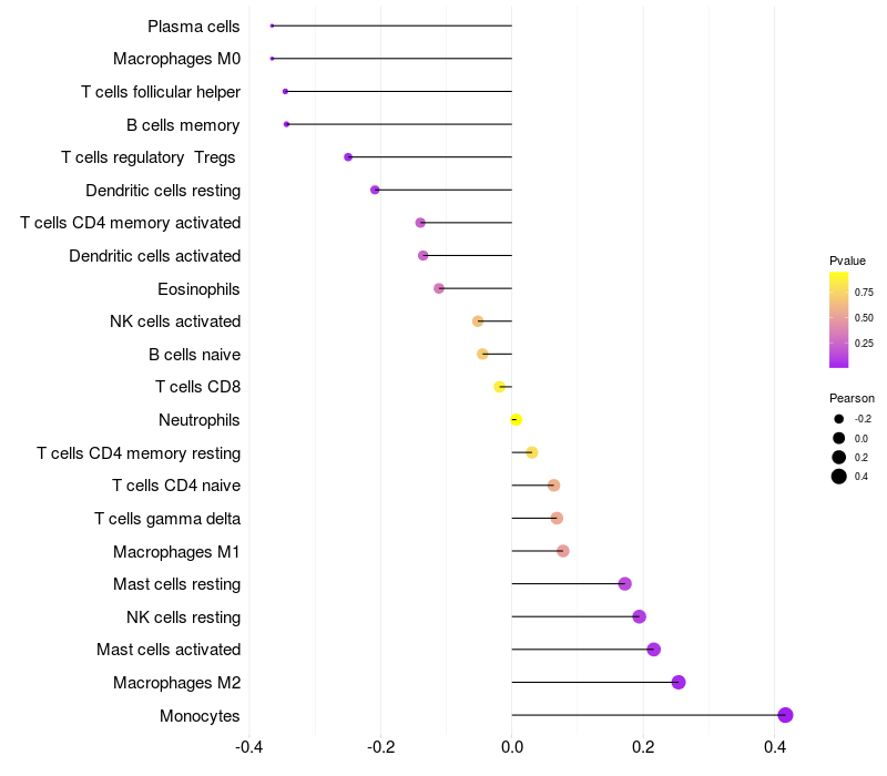 Lollipop of CRADD expression and immune infiltrating cell level correlation result in HBV+ samples