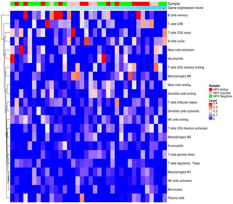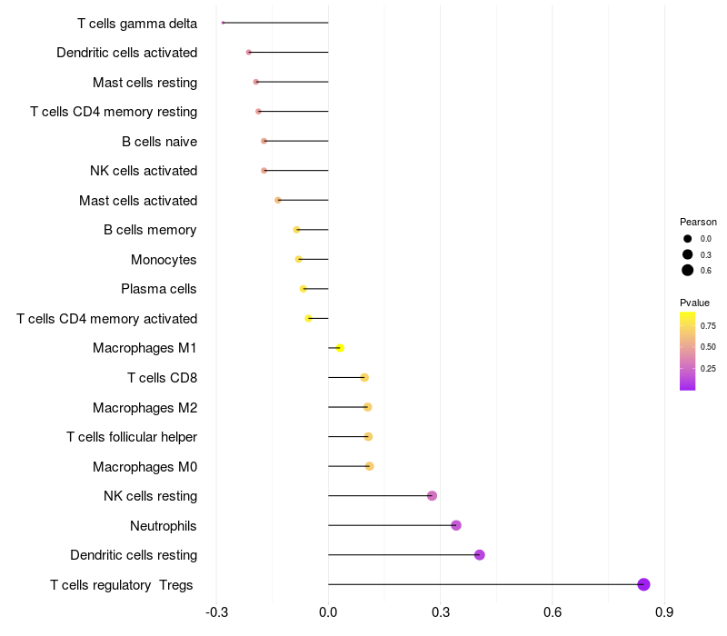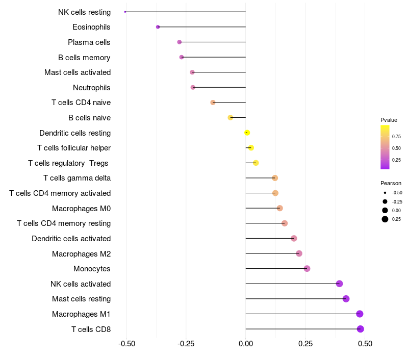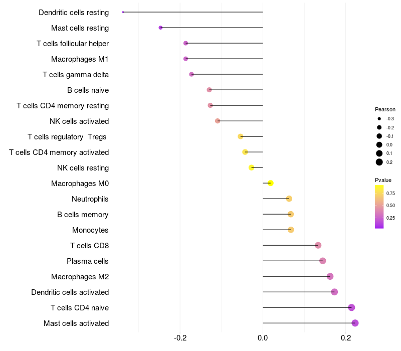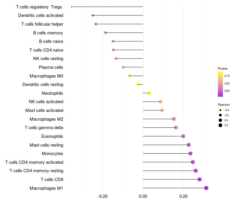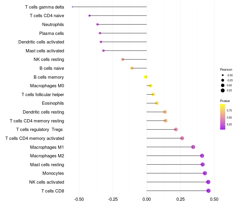 Lollipop of CRAT expression and immune infiltrating cell level correlation result in HPV+ samples
