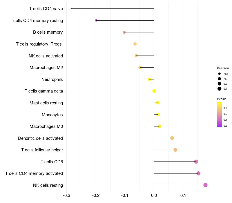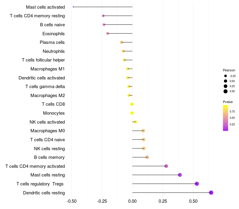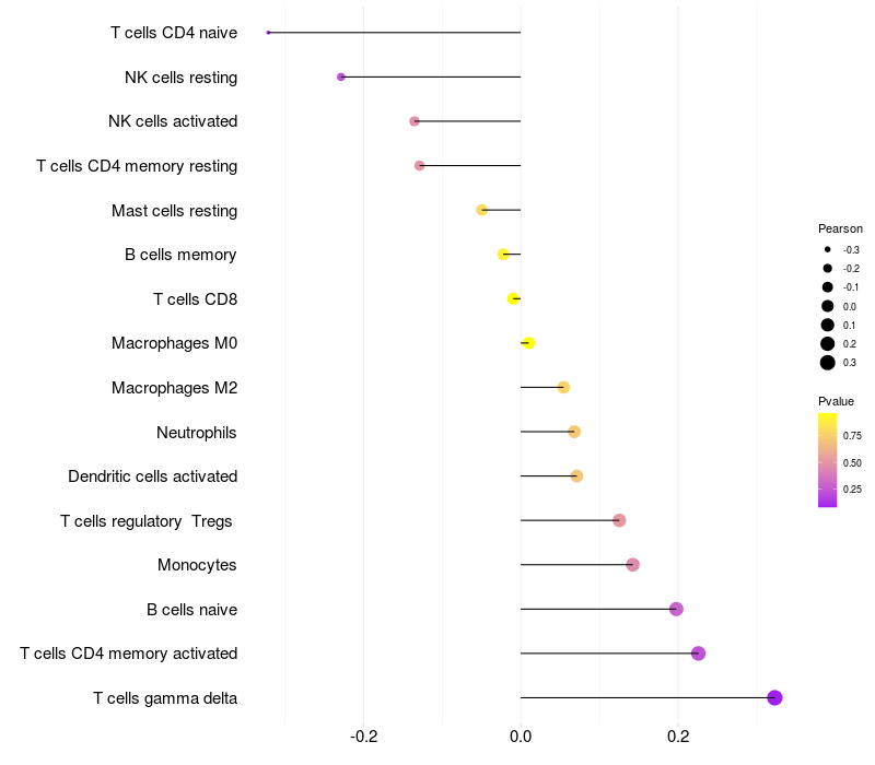 Lollipop of CRB1 expression and immune infiltrating cell level correlation result in HTLV1+ samples