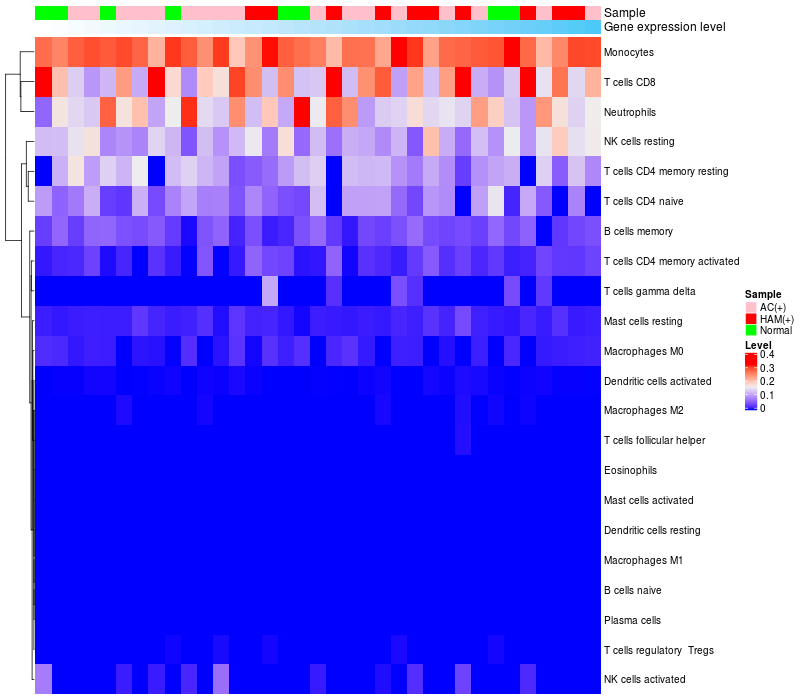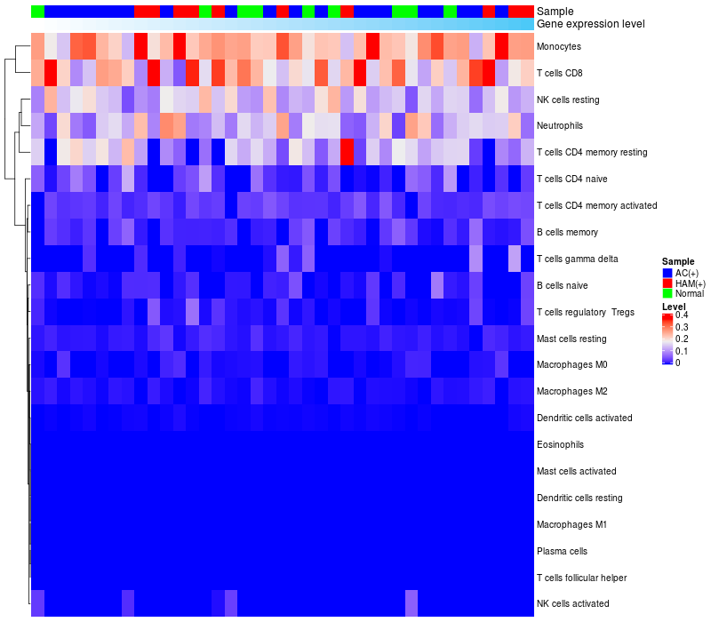 Normal (8), Asymptomatic carriers (HTLV1+)(17), HTLV-1-associated myelopathy (HTLV1+)(10) |
