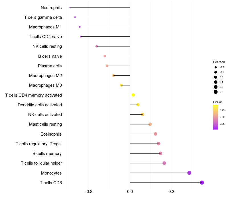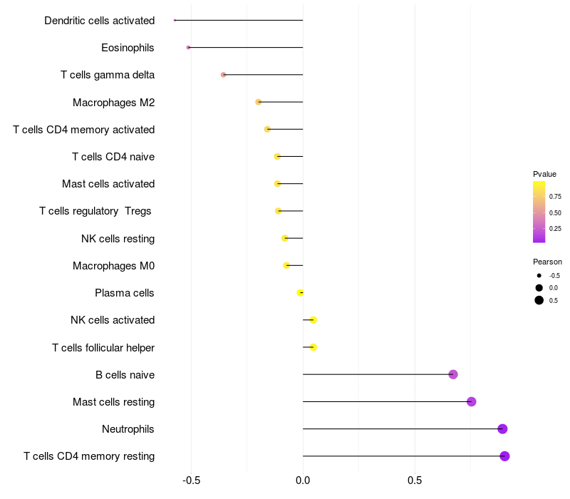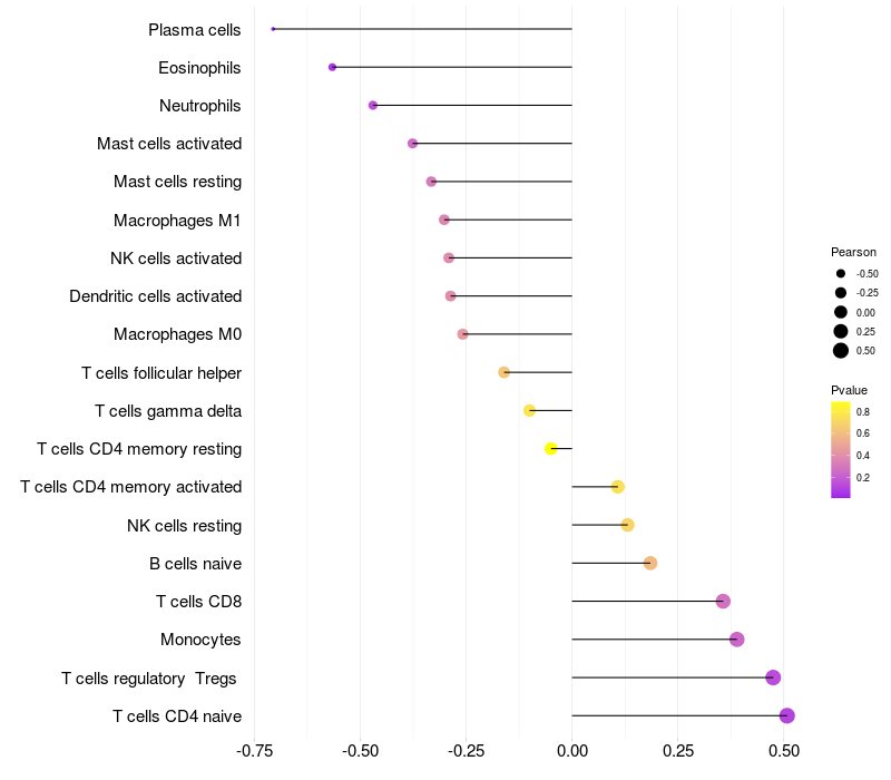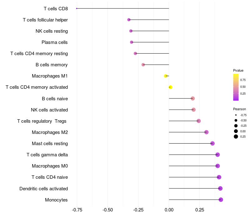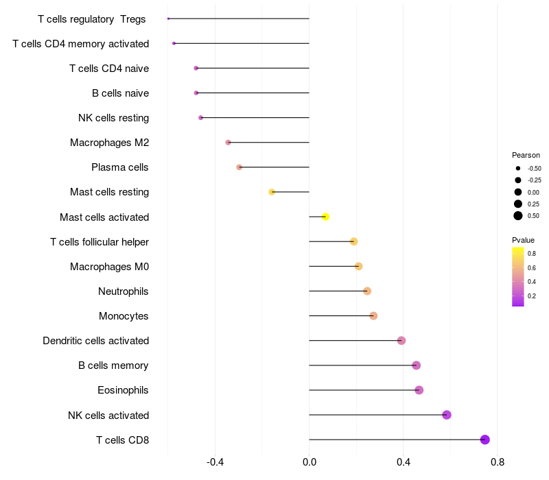 Lollipop of CREBL2 expression and immune infiltrating cell level correlation result in EBV+ samples