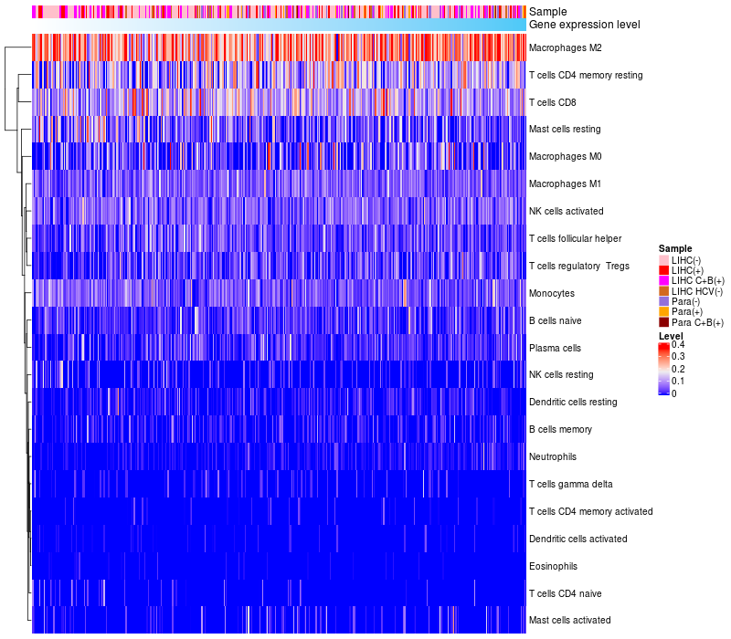 Liver hepatocellular carcinoma HCV (HBV+)(86), Liver hepatocellular carcinoma HCV (HBV-)(19), Liver hepatocellular carcinoma (HBV+)(209), Liver hepatocellular carcinoma (HBV+)(60), Paracancerous HCV (HBV+)(4), Paracancerous (HBV-)(28), Paracancerous (HBV+)(18) |