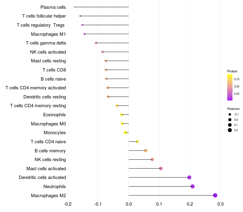 Lollipop of CRP expression and immune infiltrating cell level correlation result in HBV+ samples