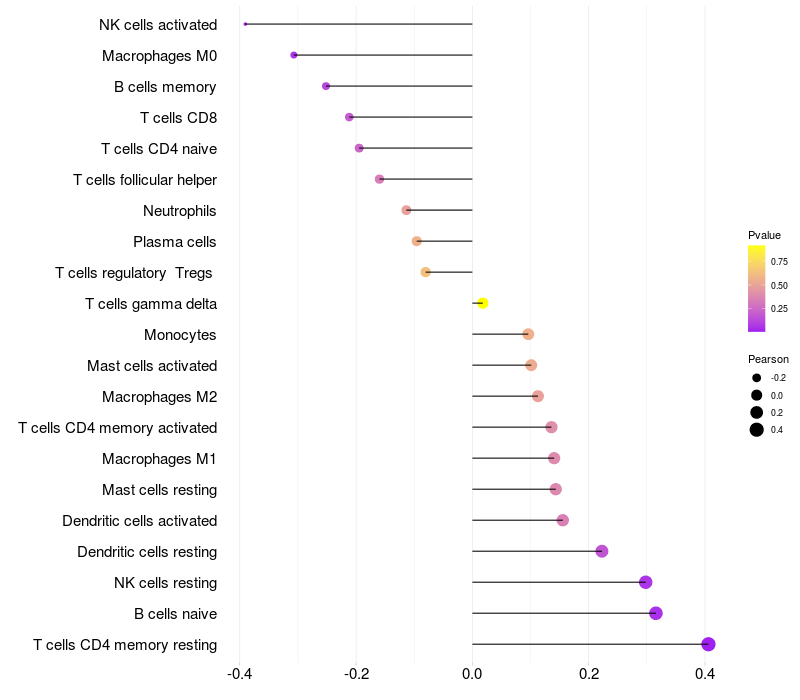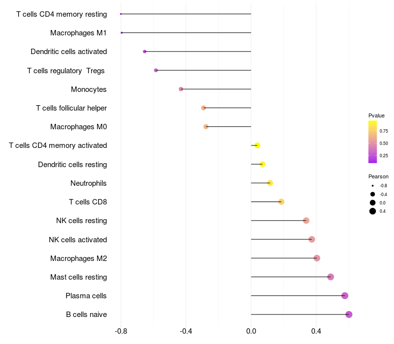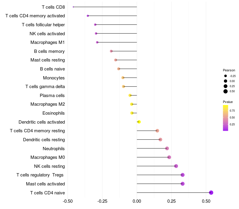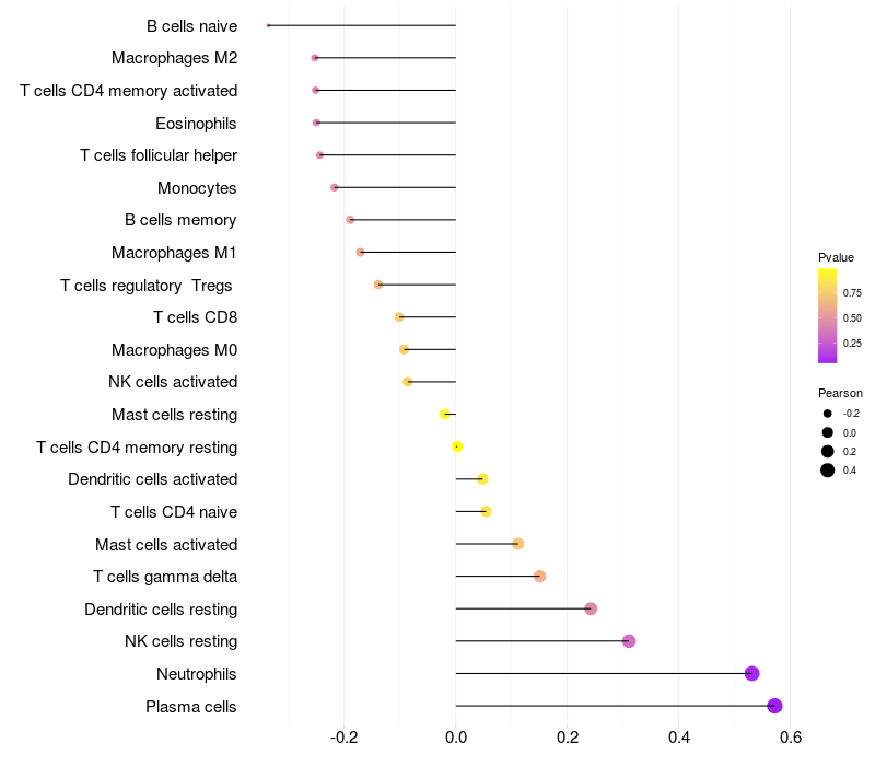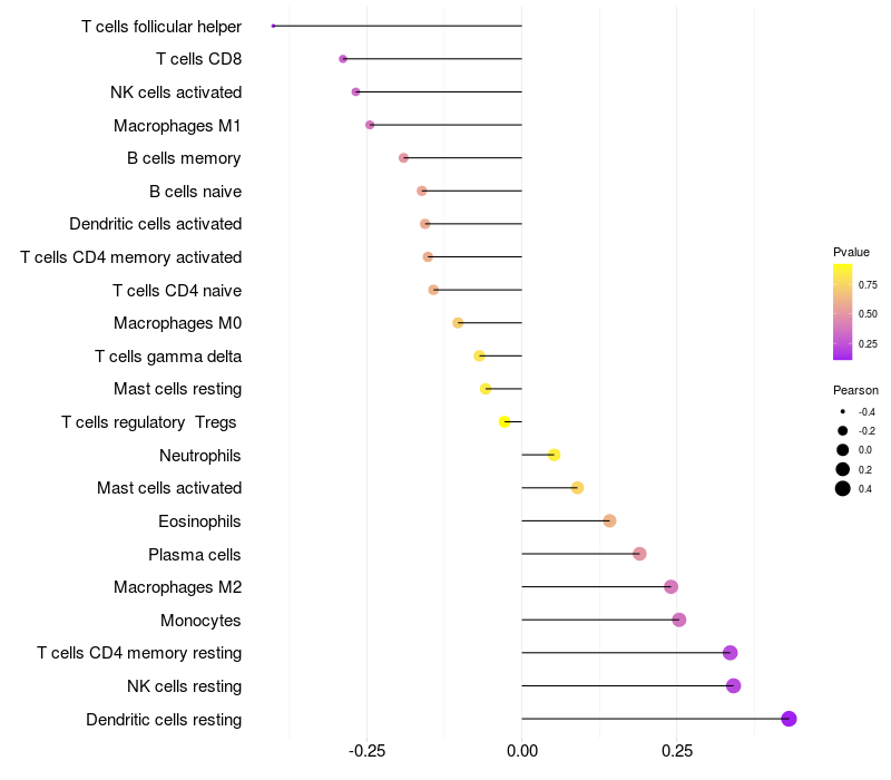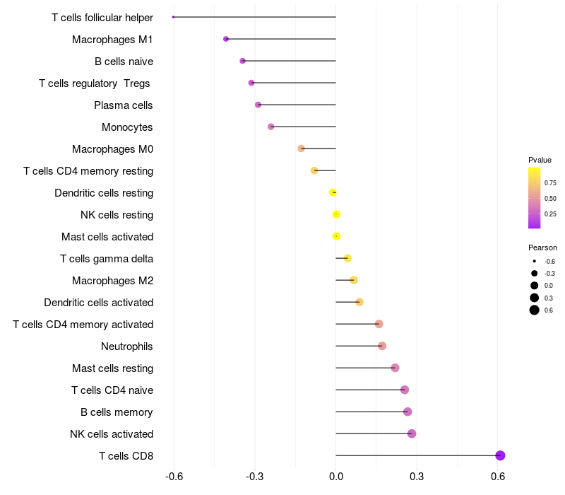 Lollipop of CSDE1 expression and immune infiltrating cell level correlation result in HPV+ samples