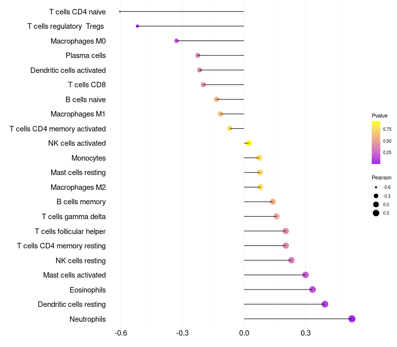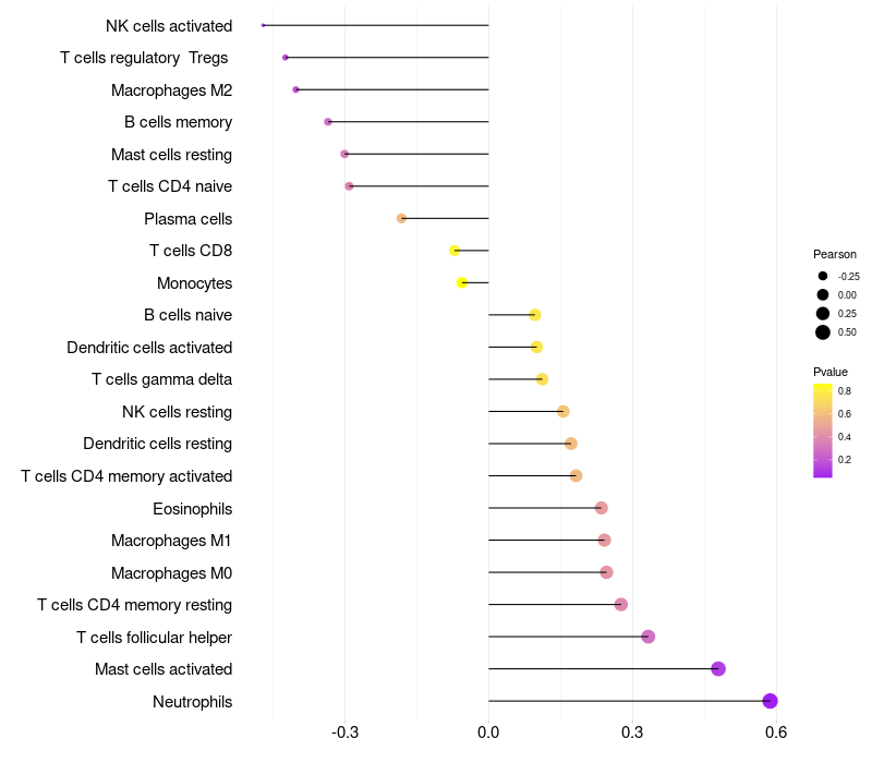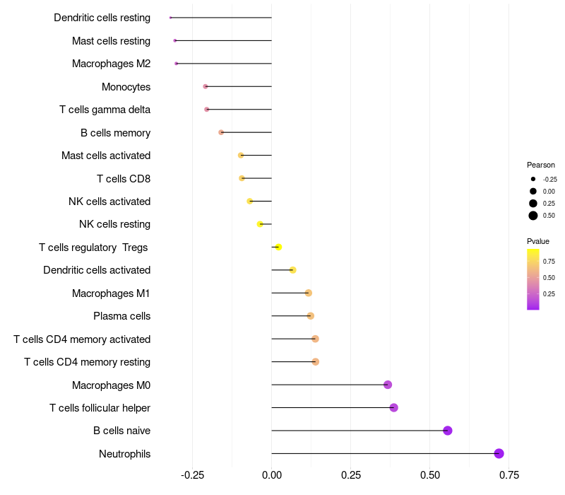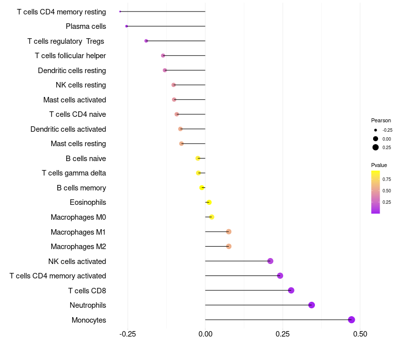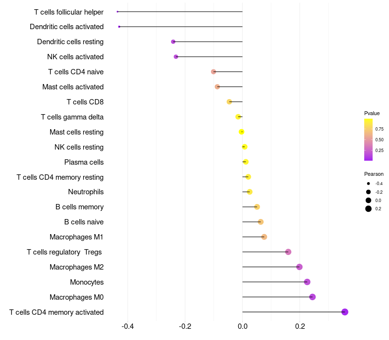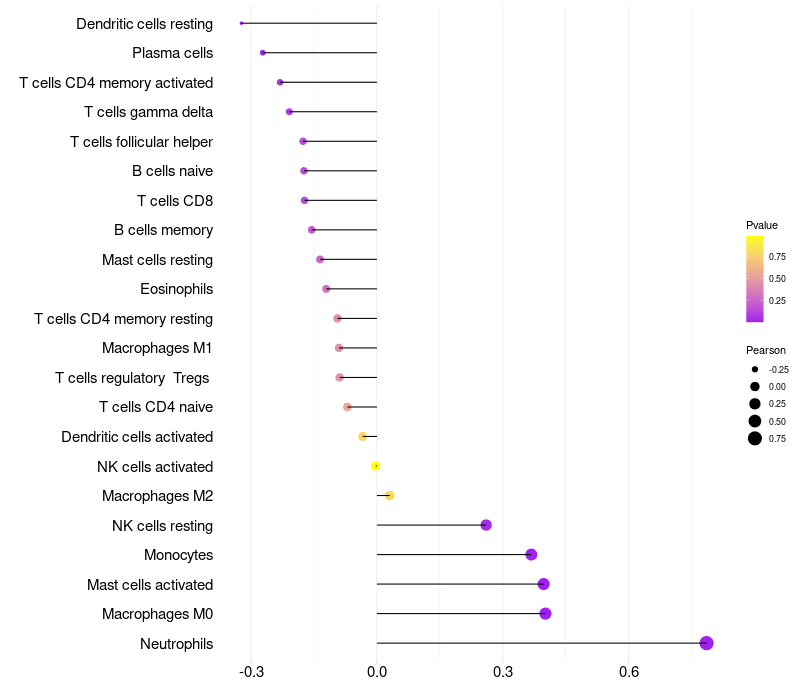 Lollipop of CSF3R expression and immune infiltrating cell level correlation result in HPV+ samples