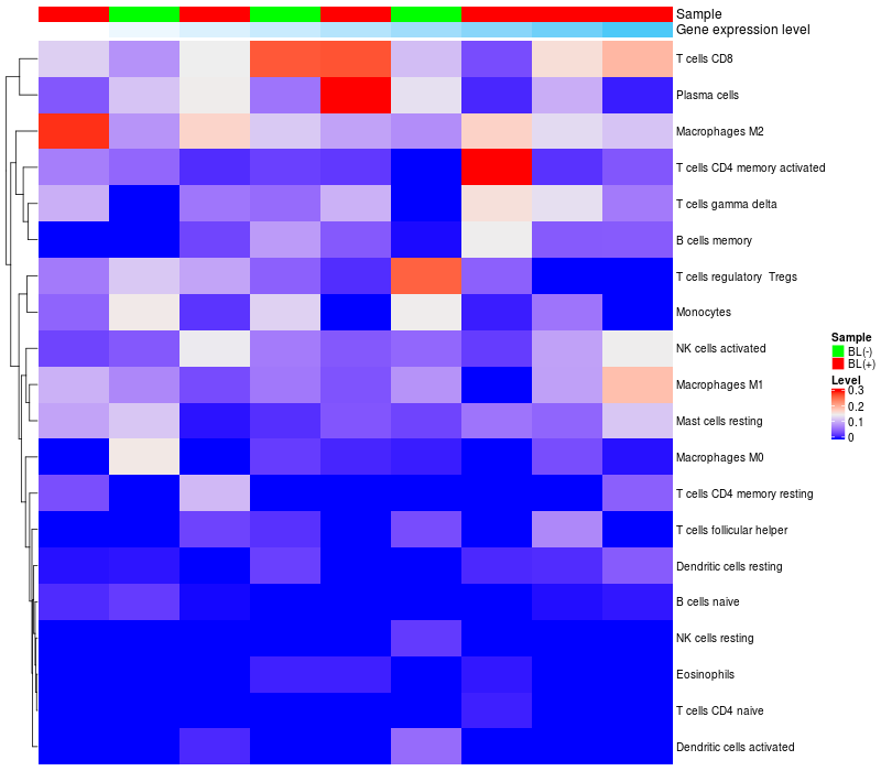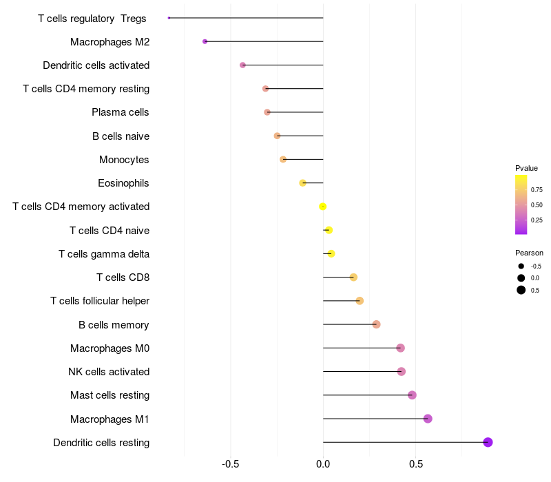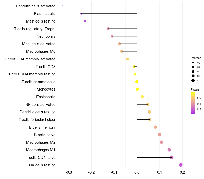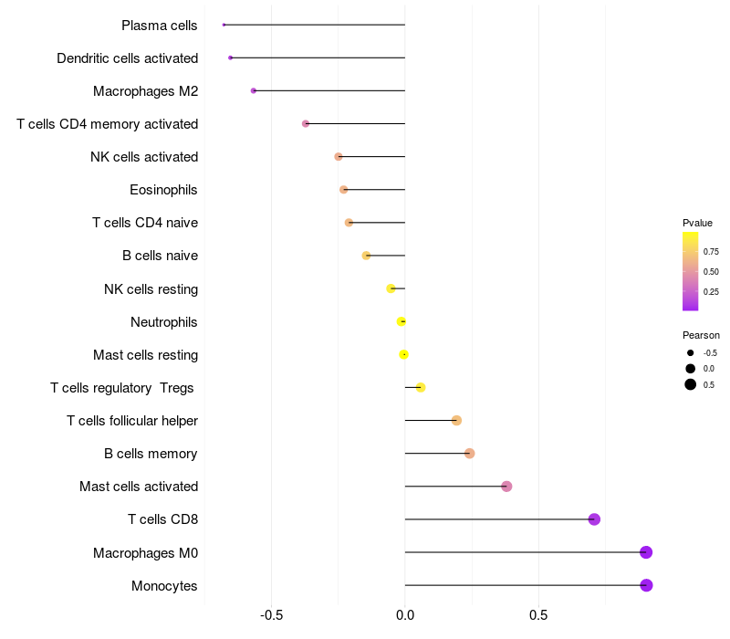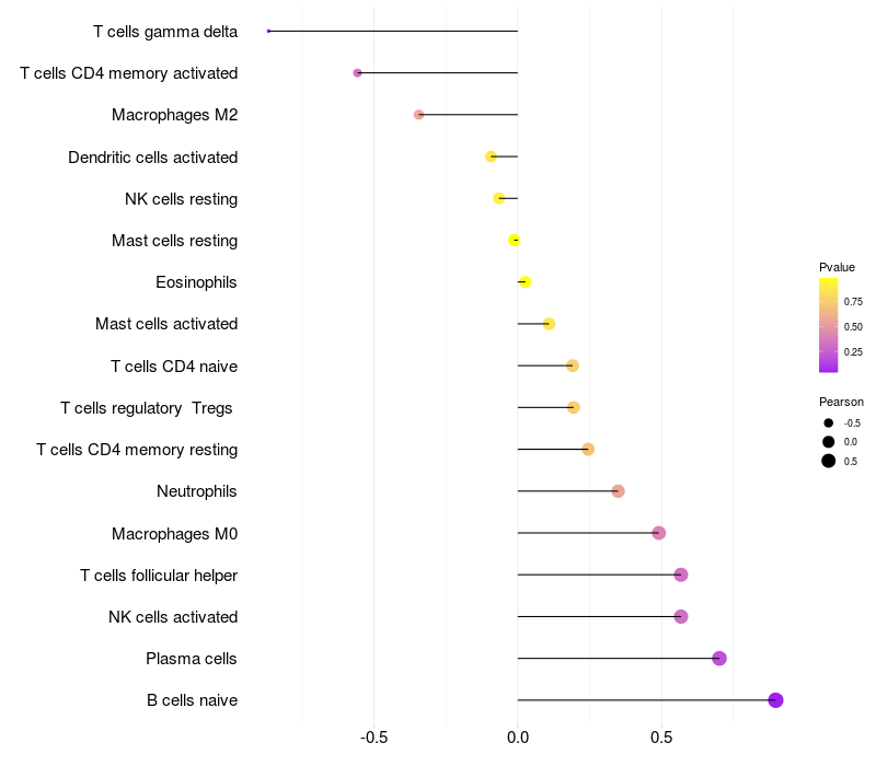 Lollipop of CST11 expression and immune infiltrating cell level correlation result in EBV+ samples