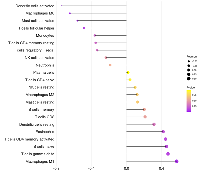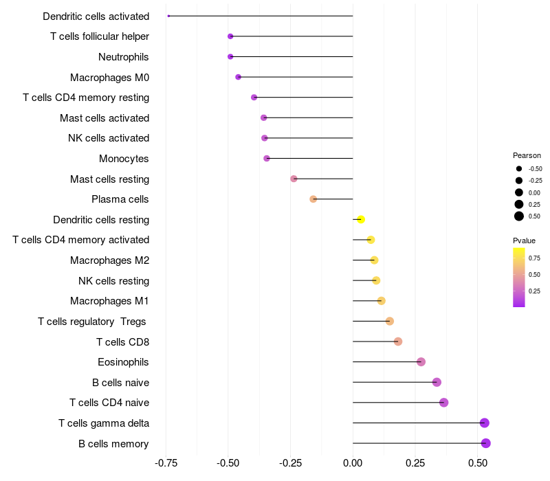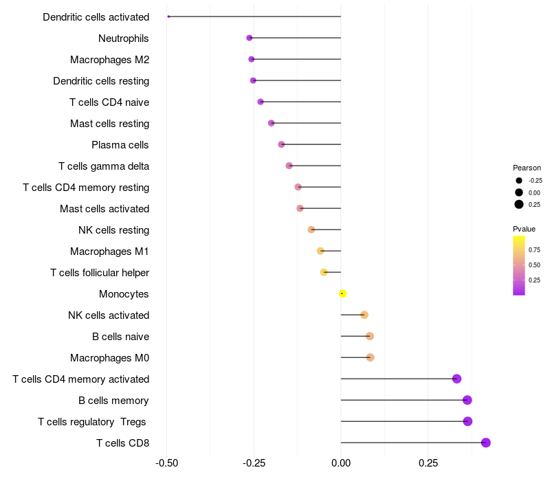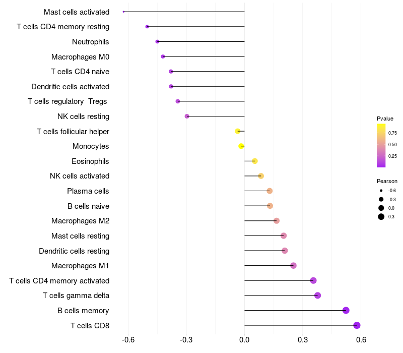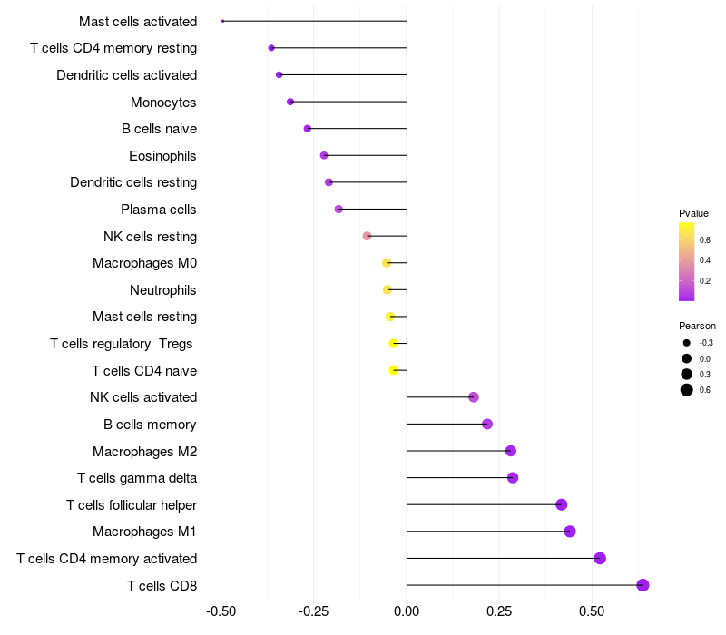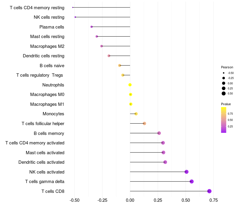 Lollipop of CST7 expression and immune infiltrating cell level correlation result in HPV+ samples