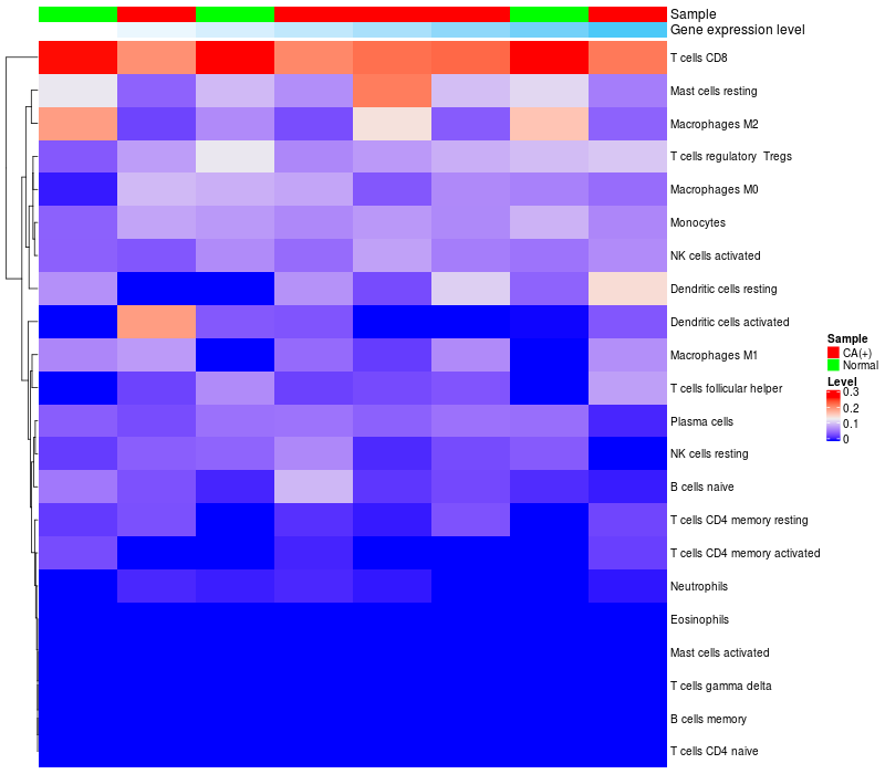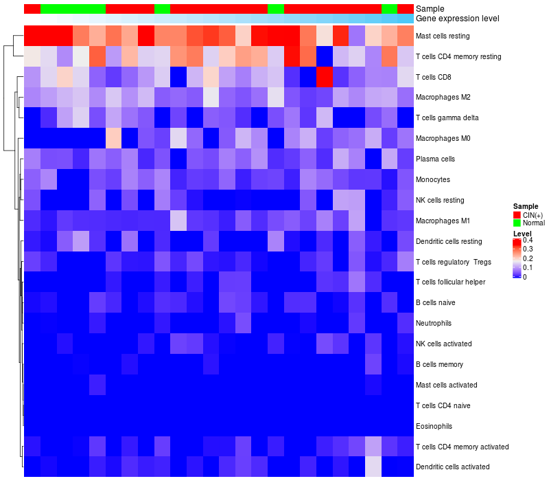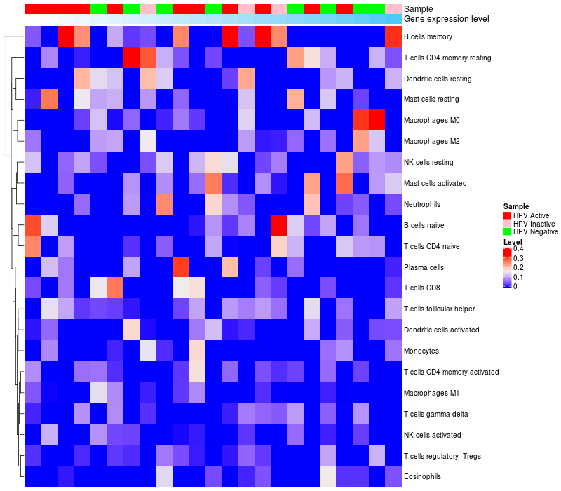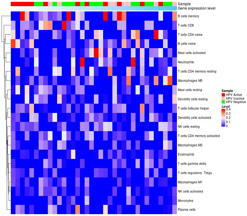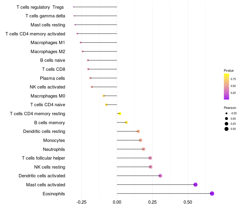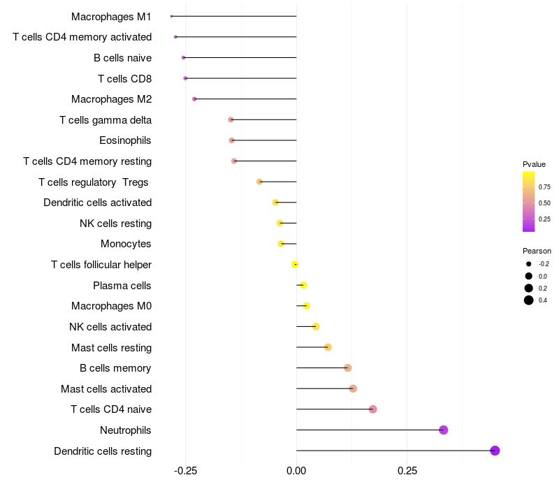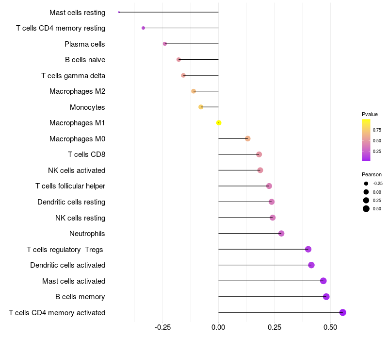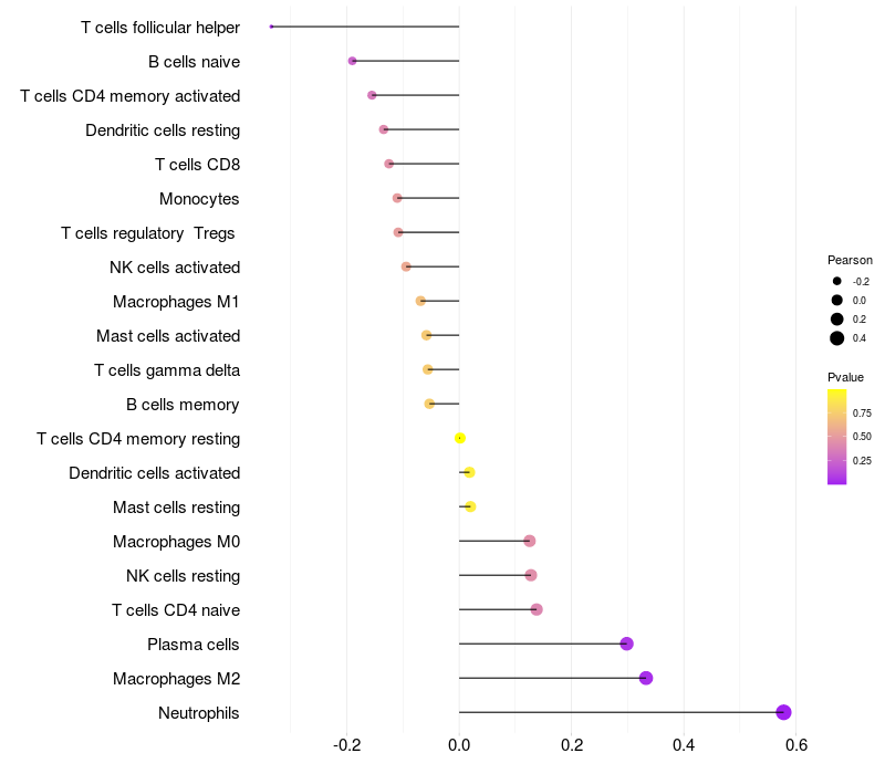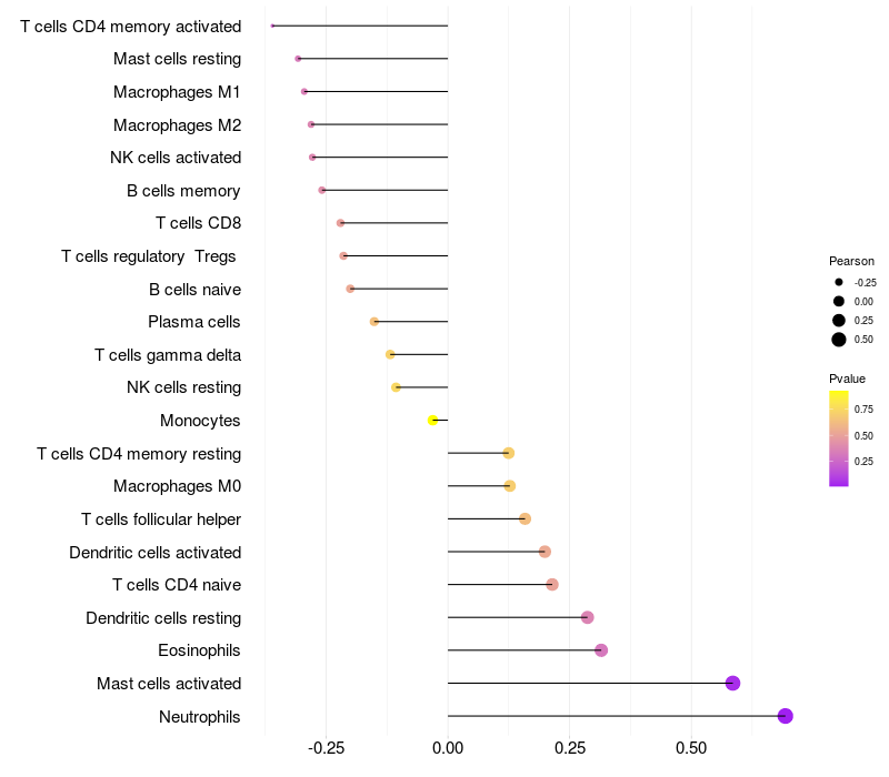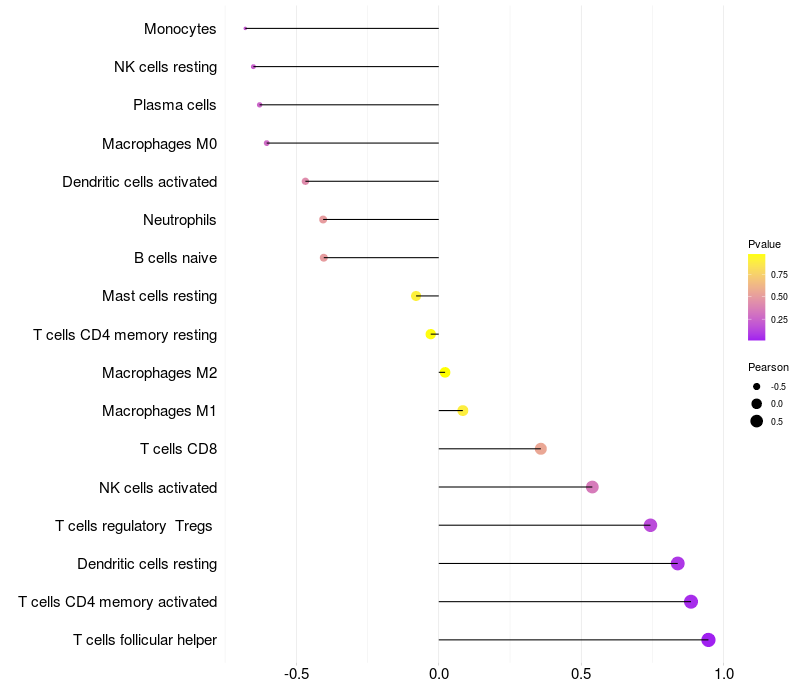Lollipop of CST9 expression and immune infiltrating cell level correlation result in HPV+ samples