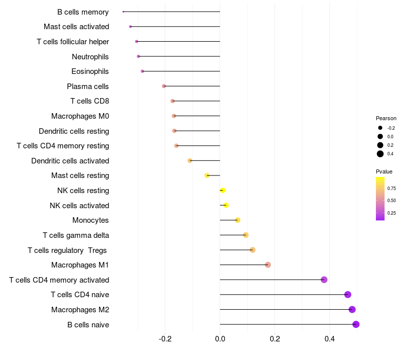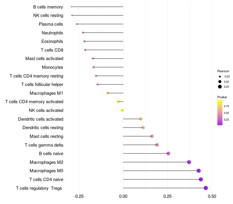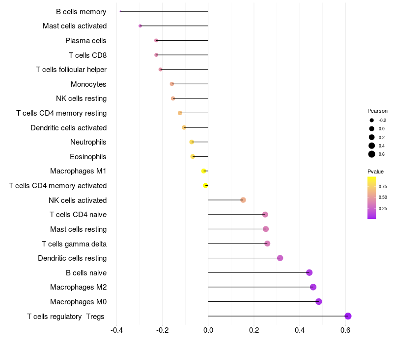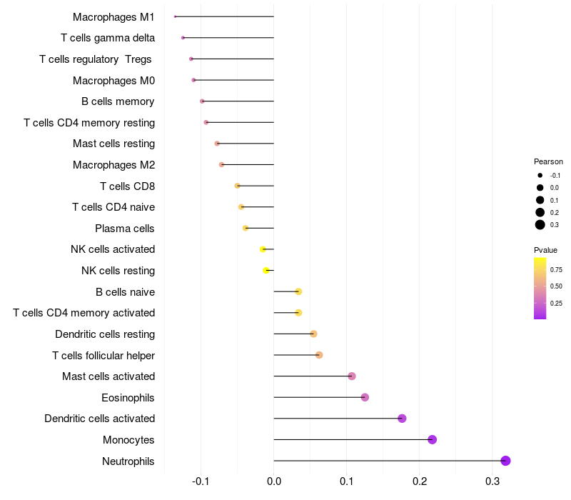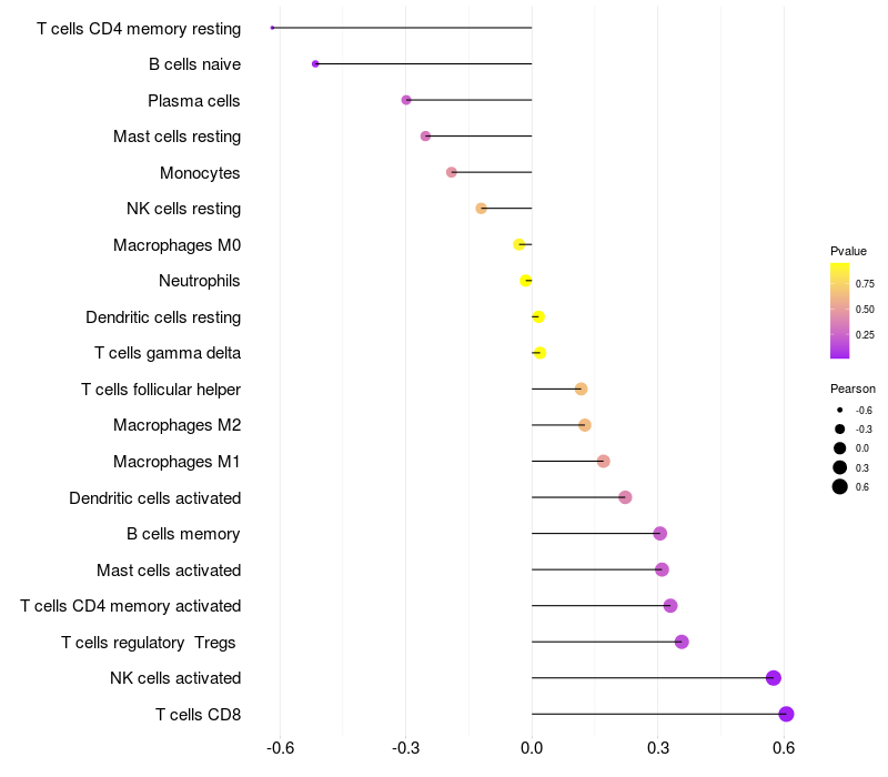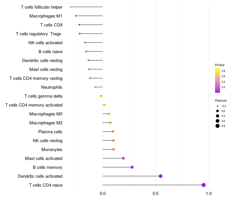 Lollipop of CT45A1 expression and immune infiltrating cell level correlation result in HPV+ samples