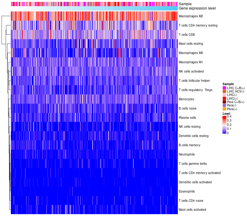 Liver hepatocellular carcinoma HCV (HBV+)(86), Liver hepatocellular carcinoma HCV (HBV-)(19), Liver hepatocellular carcinoma (HBV+)(209), Liver hepatocellular carcinoma (HBV+)(60), Paracancerous HCV (HBV+)(4), Paracancerous (HBV-)(28), Paracancerous (HBV+)(18) |