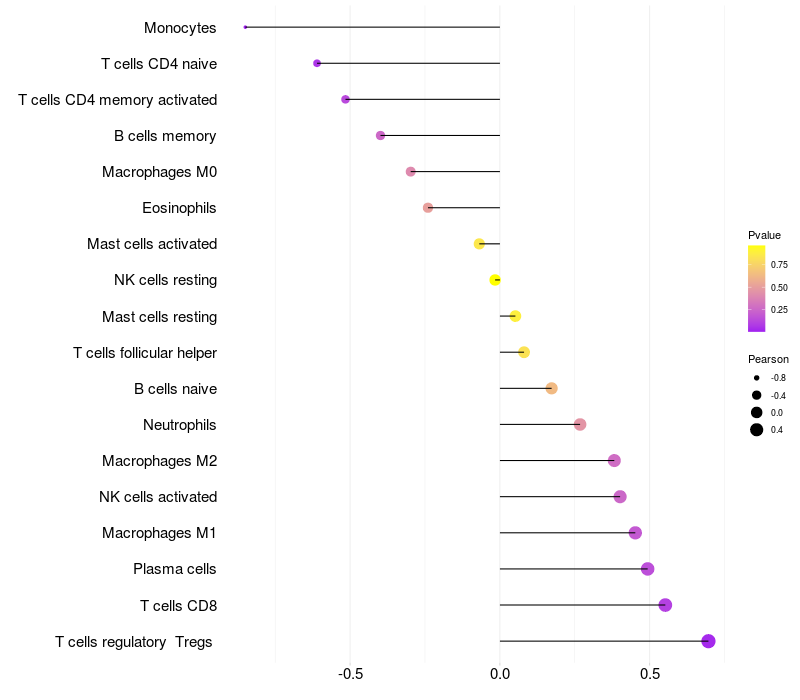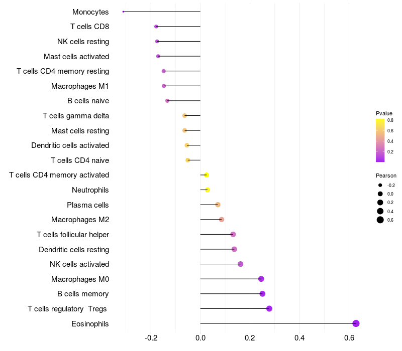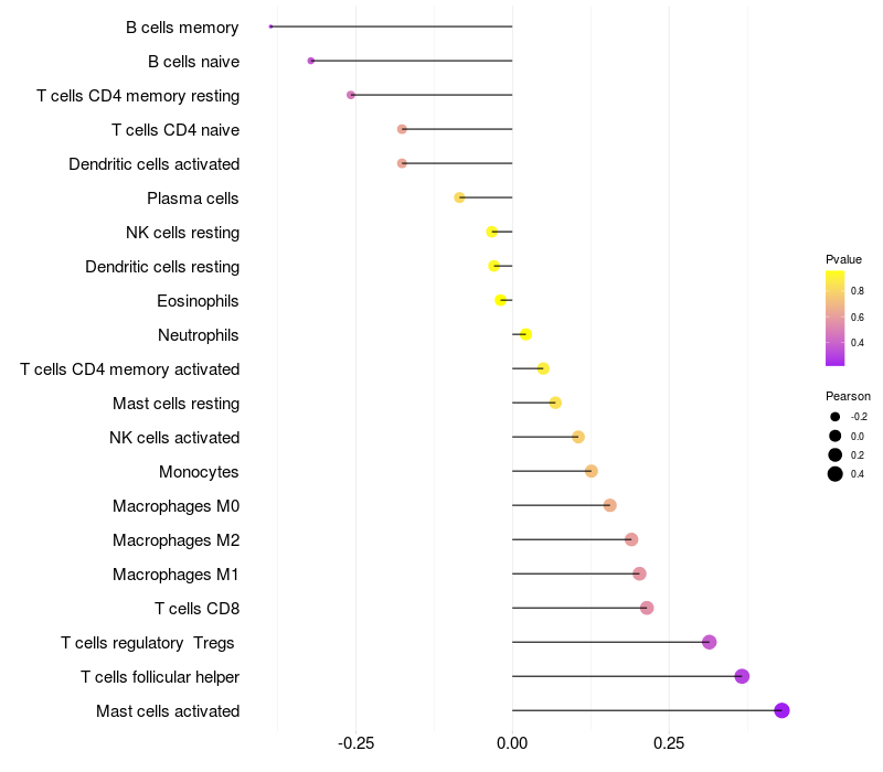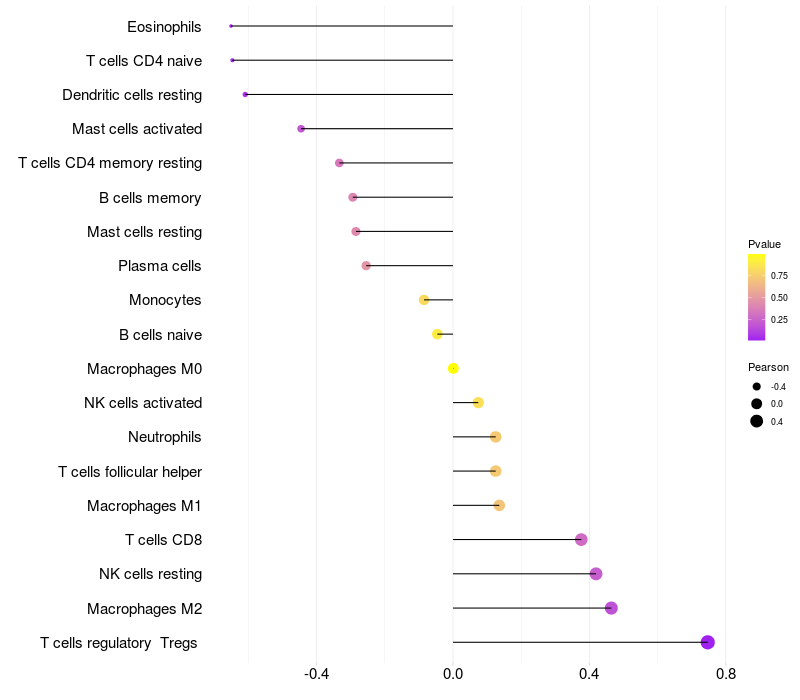 Lollipop of CTPS2 expression and immune infiltrating cell level correlation result in HBV+ Liver cirrhosis samples