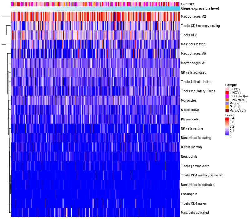 Liver hepatocellular carcinoma HCV (HBV+)(86), Liver hepatocellular carcinoma HCV (HBV-)(19), Liver hepatocellular carcinoma (HBV+)(209), Liver hepatocellular carcinoma (HBV+)(60), Paracancerous HCV (HBV+)(4), Paracancerous (HBV-)(28), Paracancerous (HBV+)(18) |