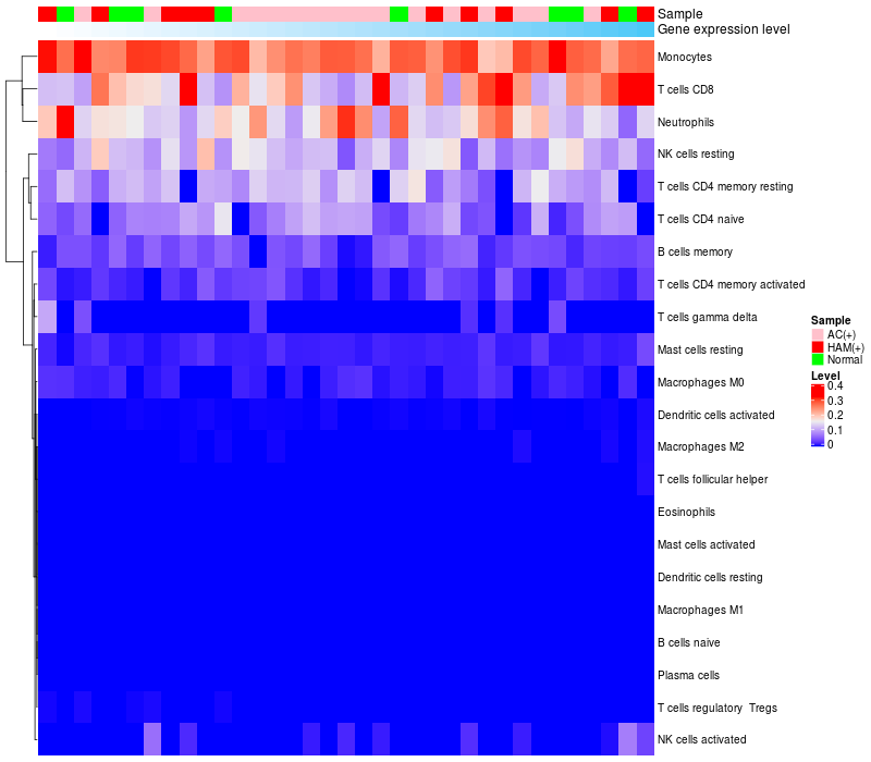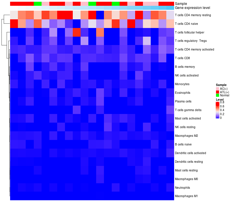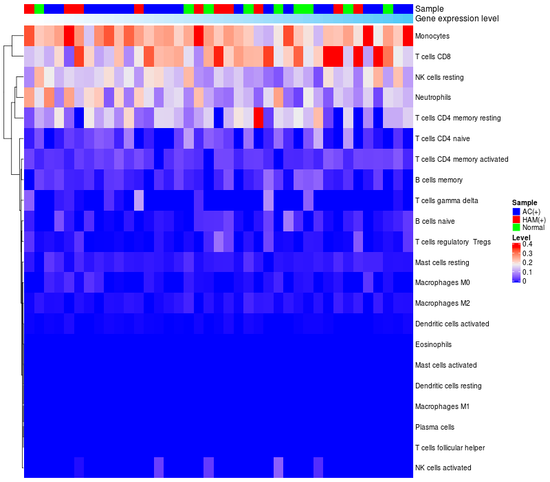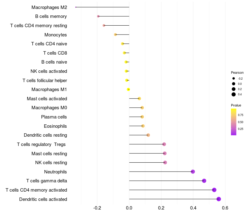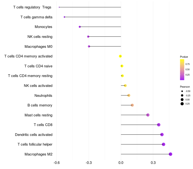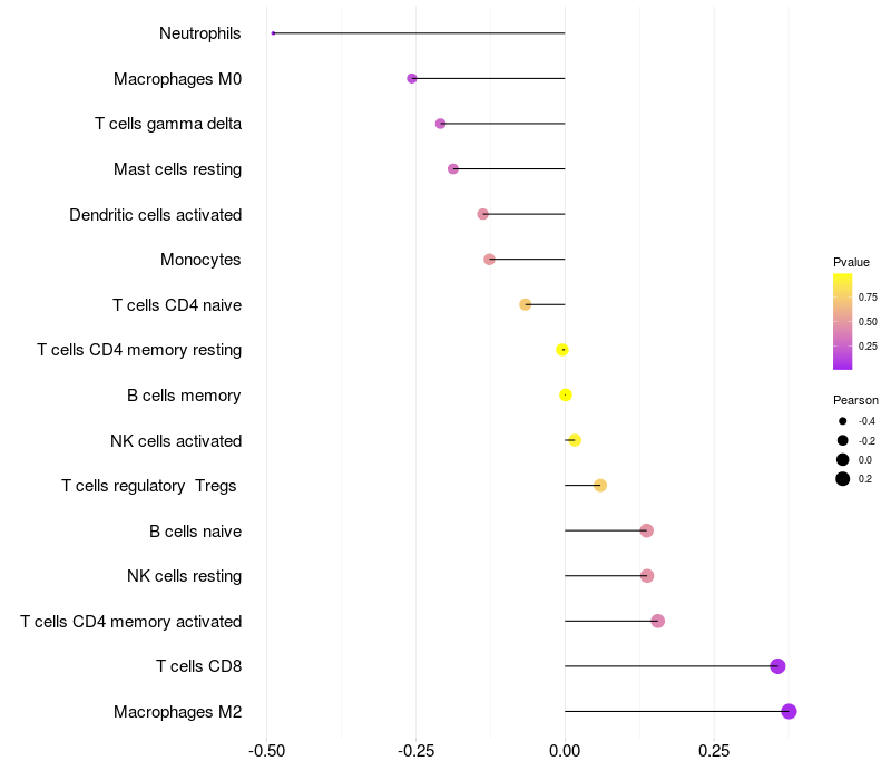 Lollipop of CTR9 expression and immune infiltrating cell level correlation result in HTLV1+ samples