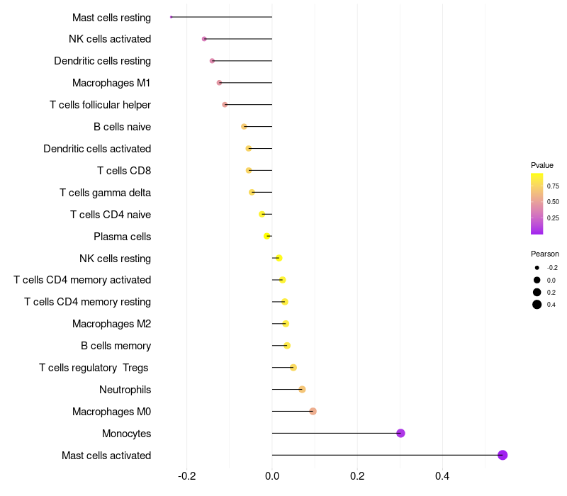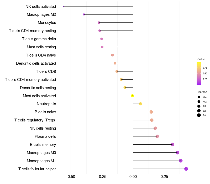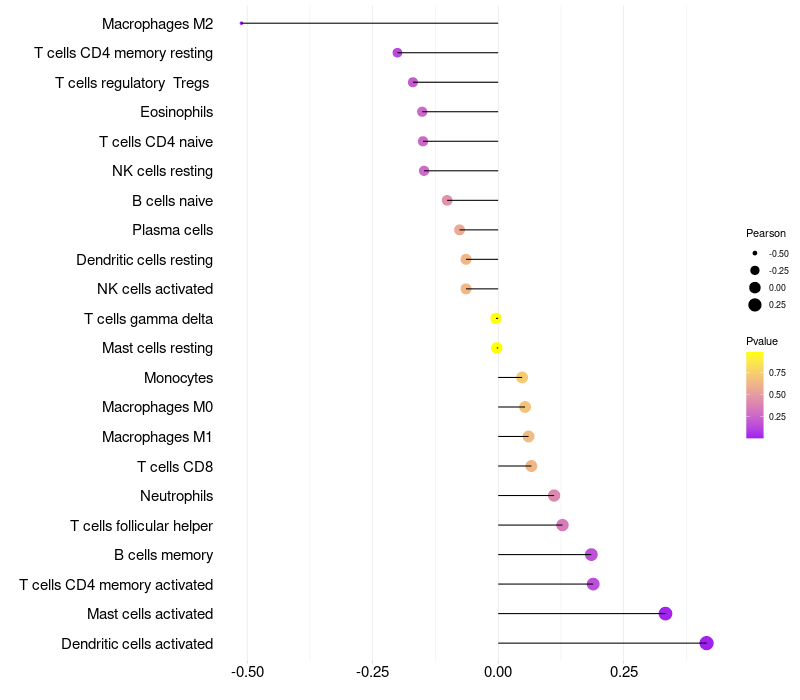 Lollipop of CXCL2 expression and immune infiltrating cell level correlation result in HPV+ samples