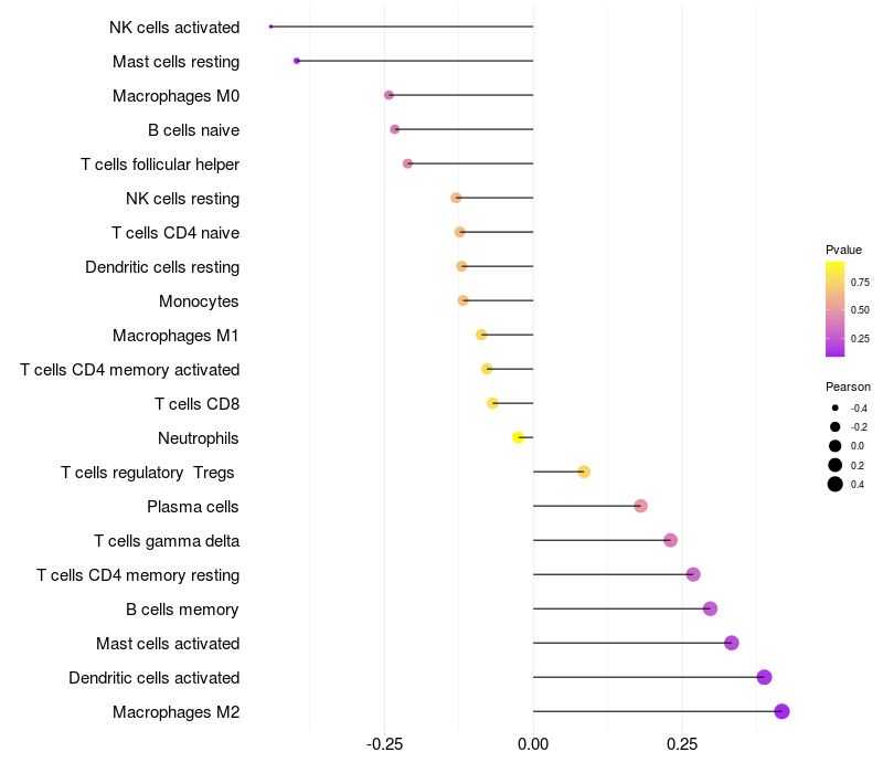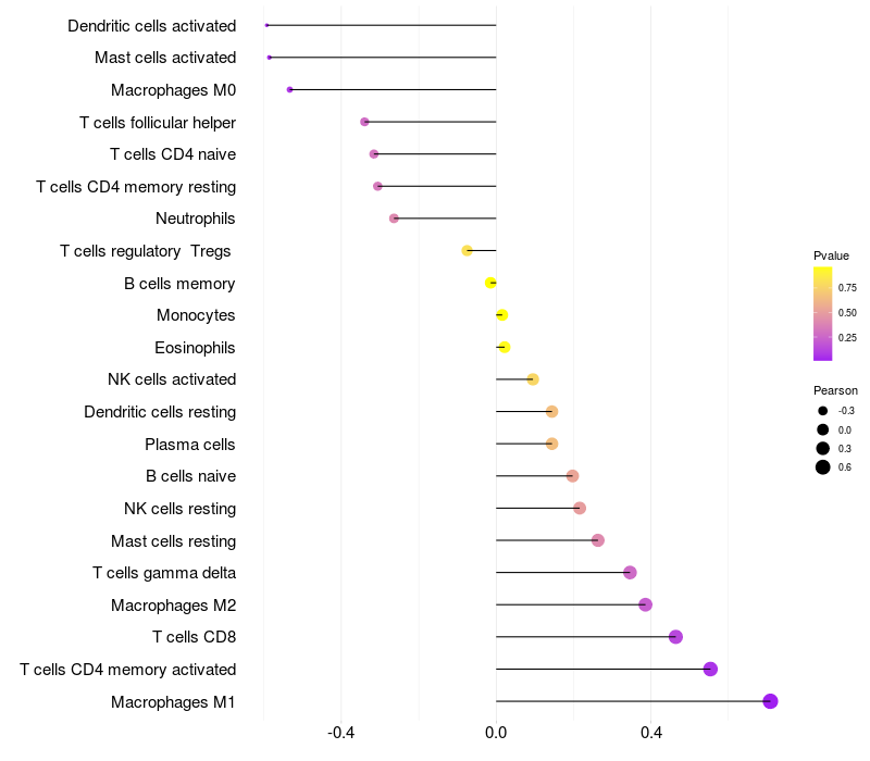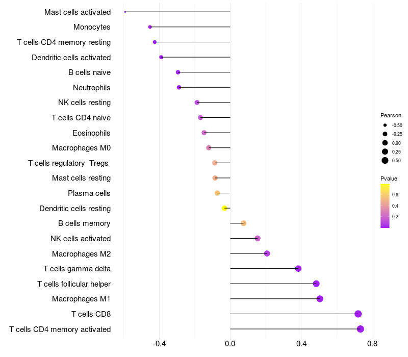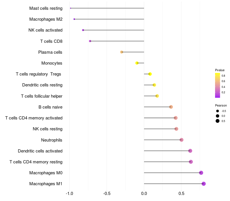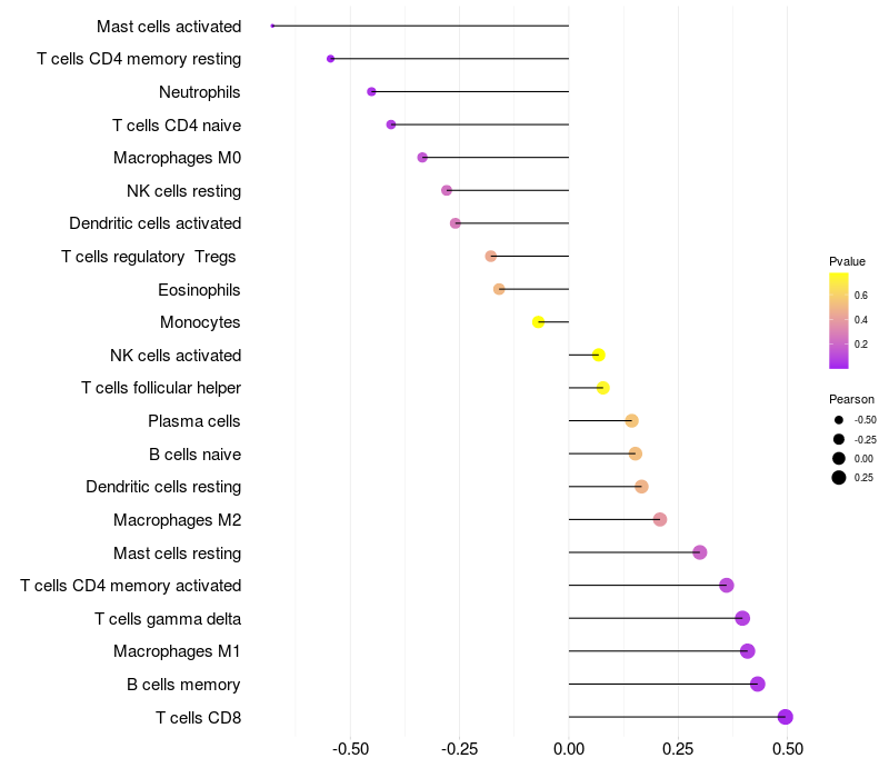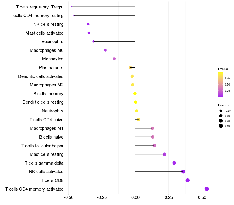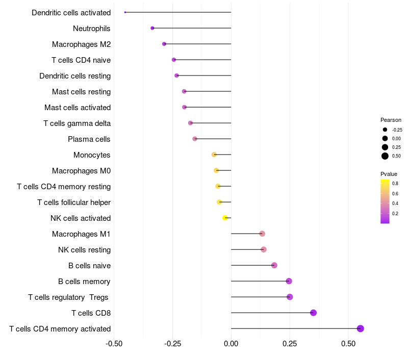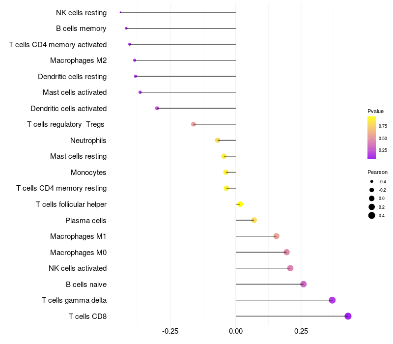 Lollipop of CXCR6 expression and immune infiltrating cell level correlation result in HPV+ samples