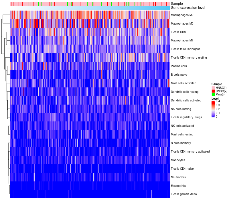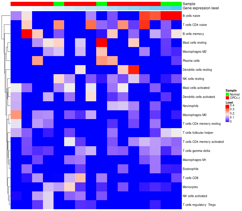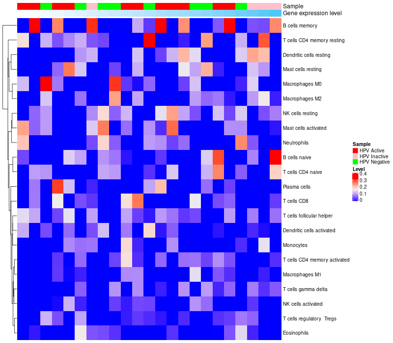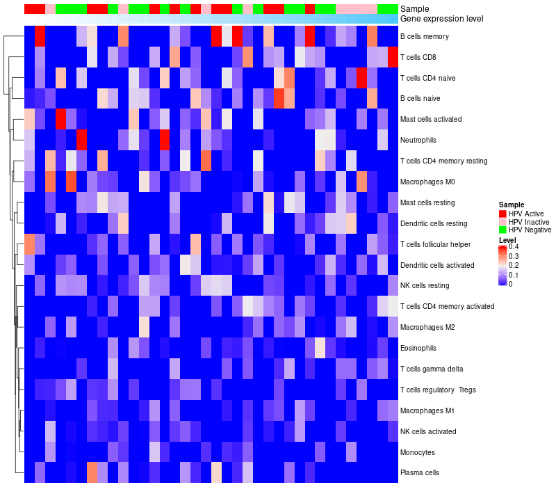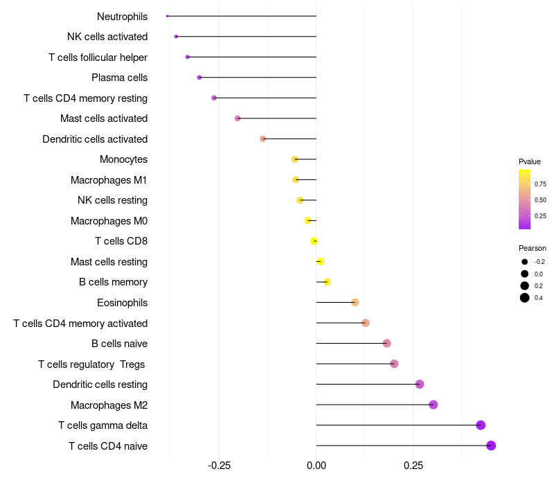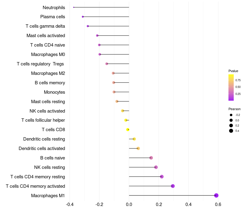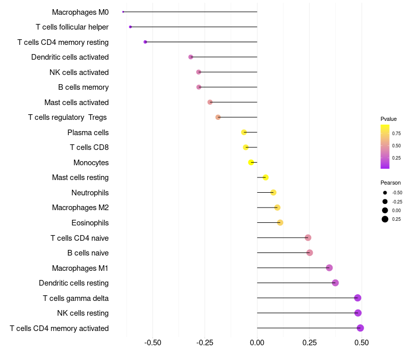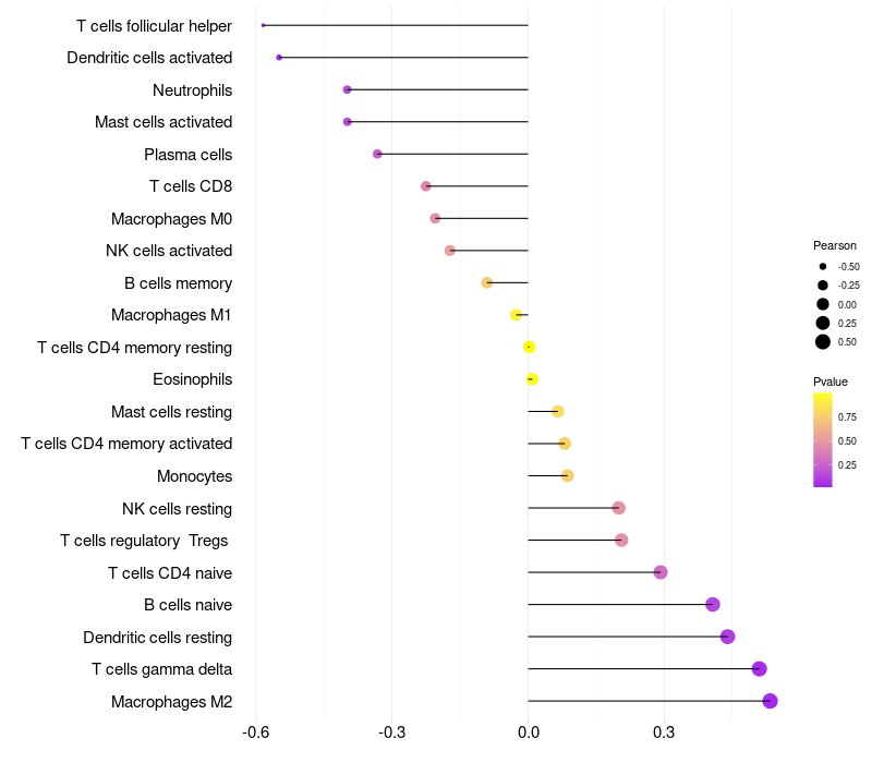 Lollipop of CXorf38 expression and immune infiltrating cell level correlation result in HPV+ samples