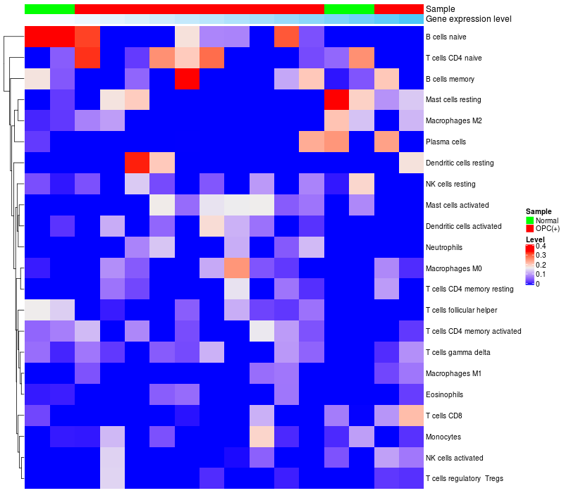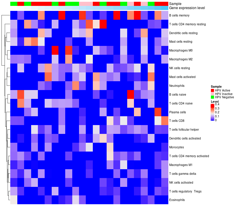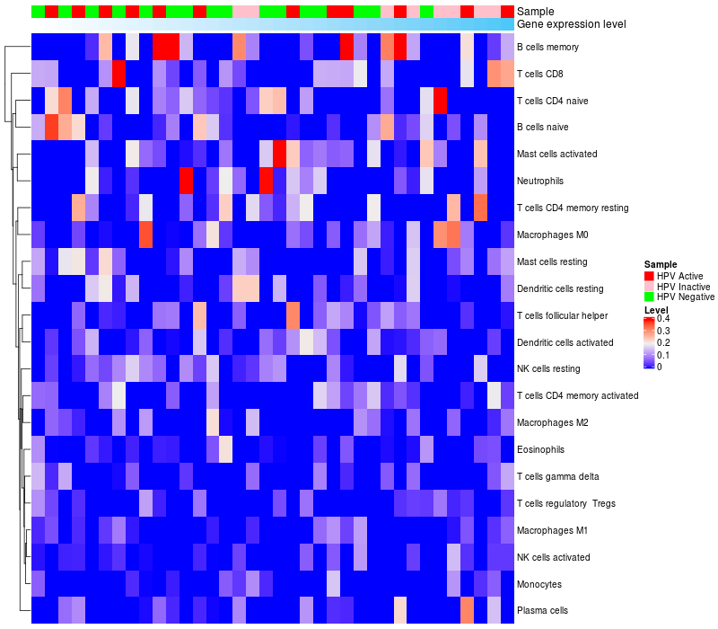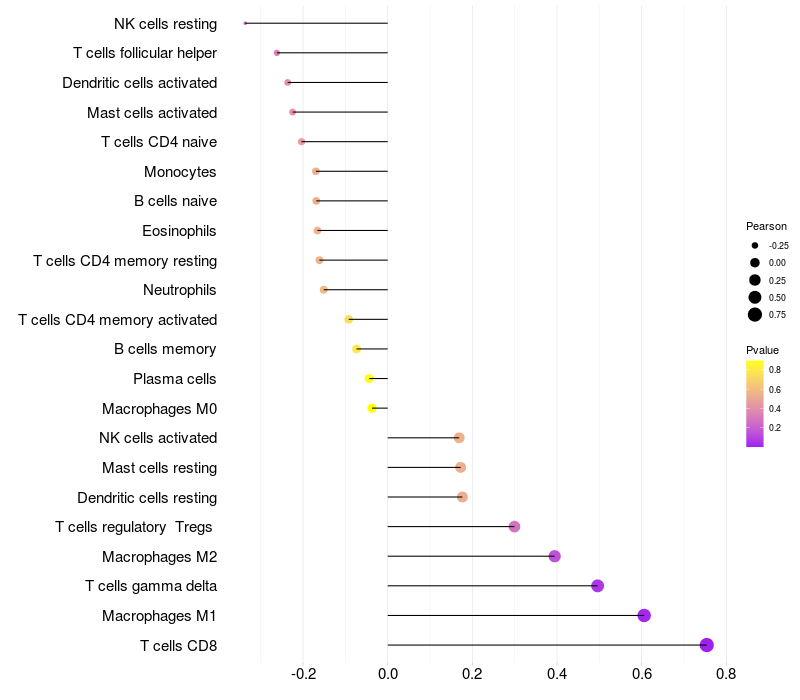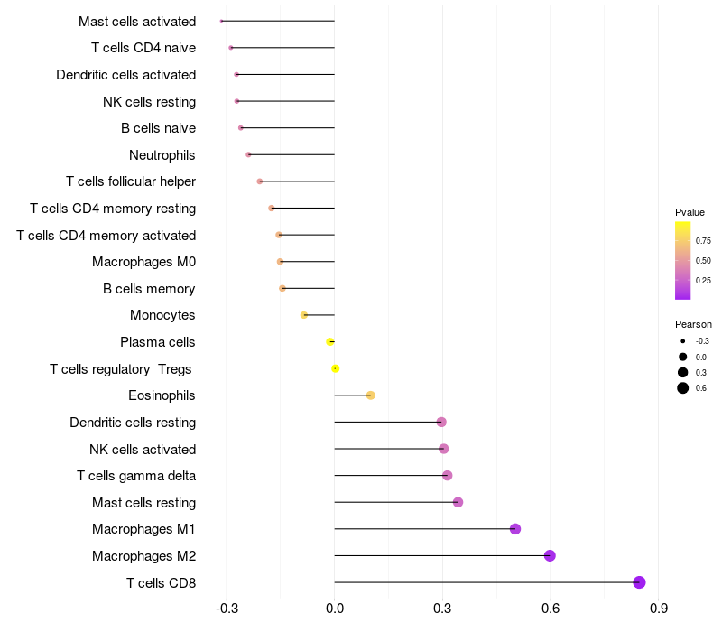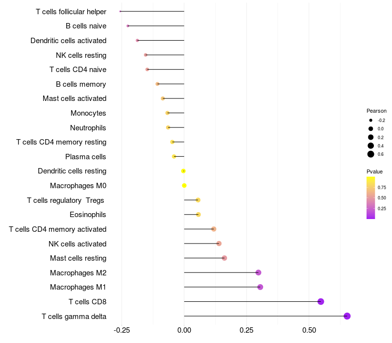 Lollipop of CXorf51A expression and immune infiltrating cell level correlation result in HPV+ samples