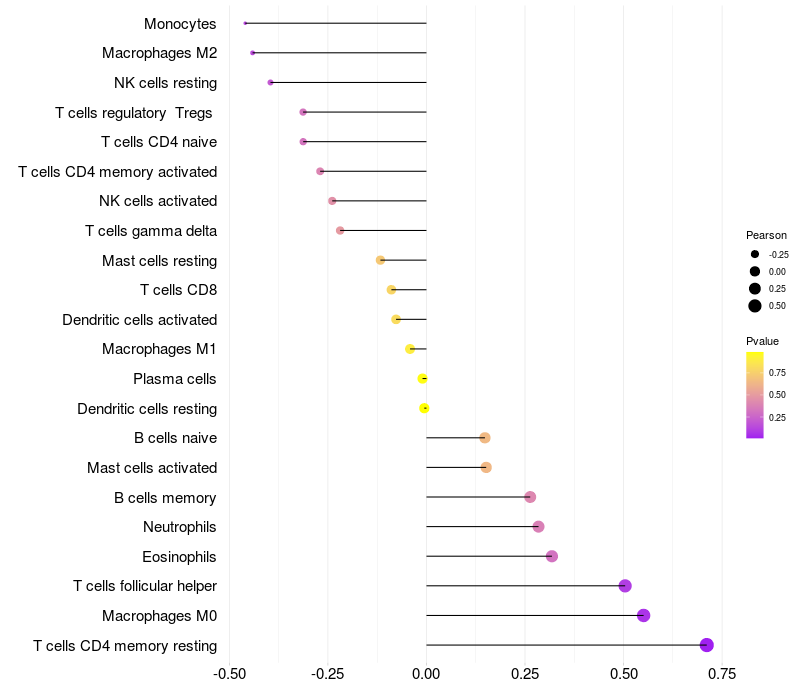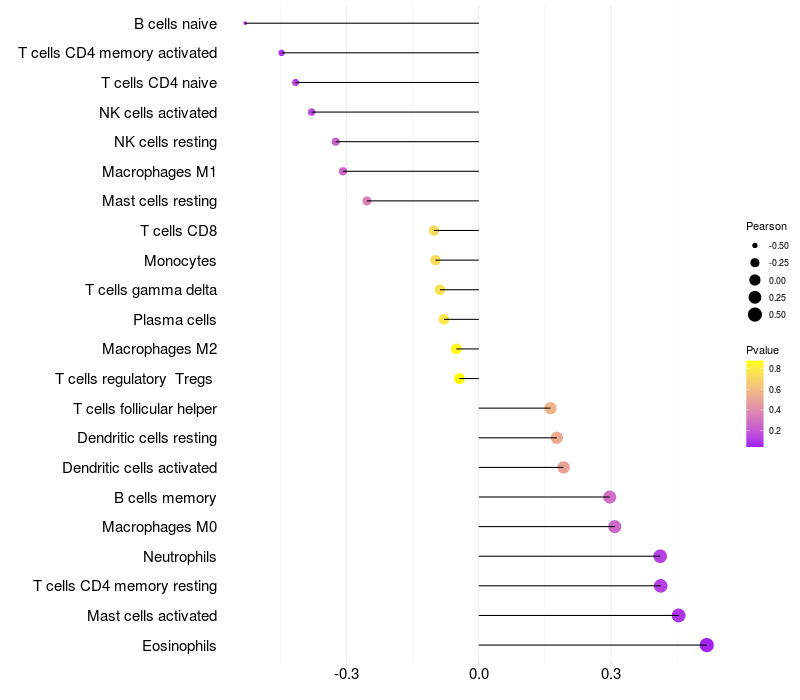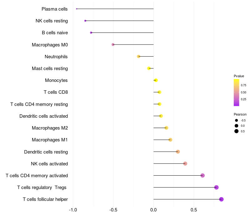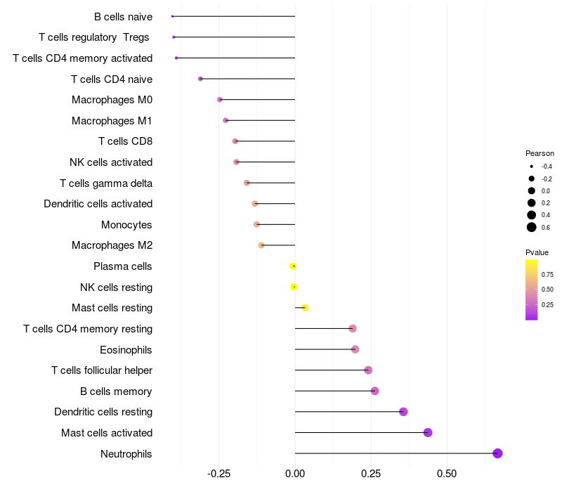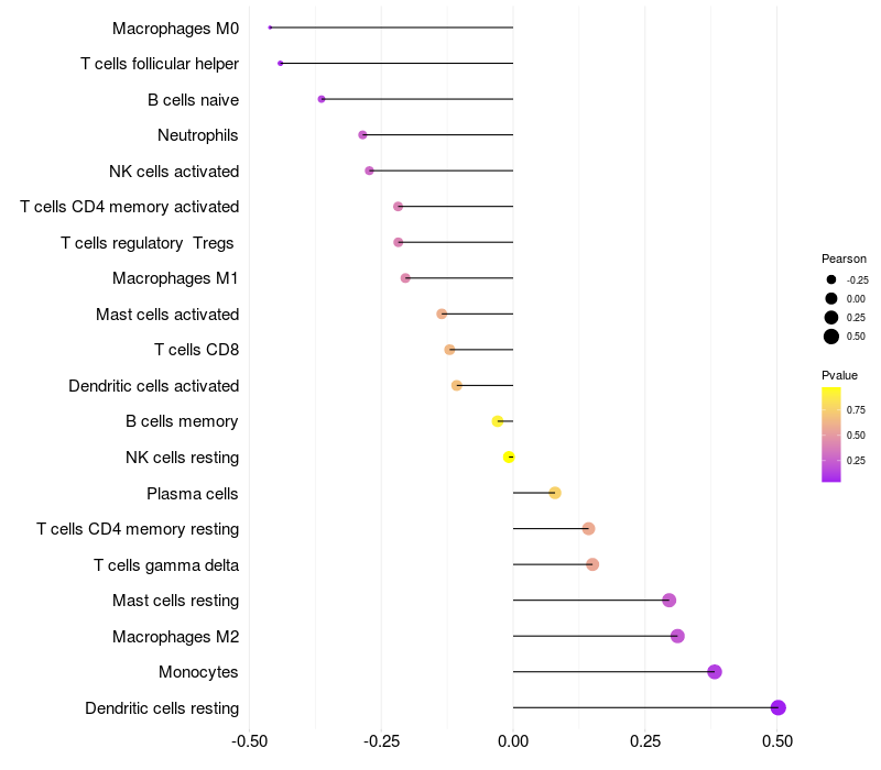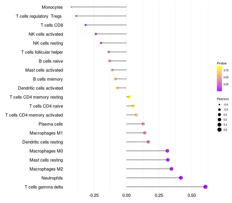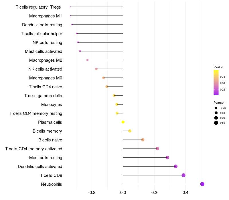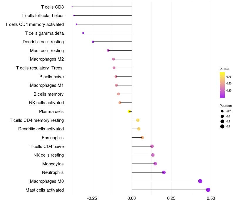 Lollipop of CYP26B1 expression and immune infiltrating cell level correlation result in HPV+ samples