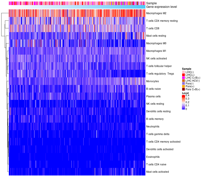 Liver hepatocellular carcinoma HCV (HBV+)(86), Liver hepatocellular carcinoma HCV (HBV-)(19), Liver hepatocellular carcinoma (HBV+)(209), Liver hepatocellular carcinoma (HBV+)(60), Paracancerous HCV (HBV+)(4), Paracancerous (HBV-)(28), Paracancerous (HBV+)(18) |