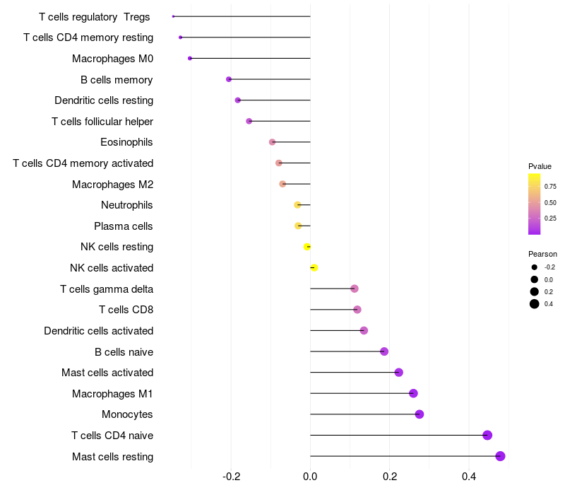 Lollipop of CYP3A4 expression and immune infiltrating cell level correlation result in HBV+ samples