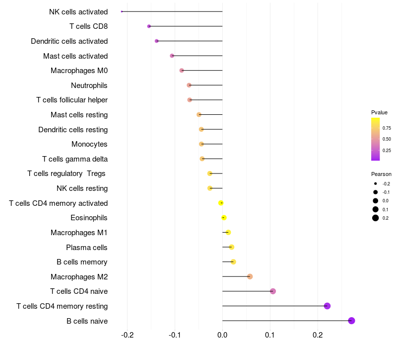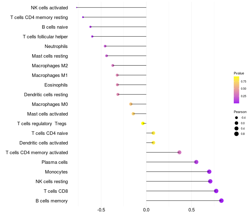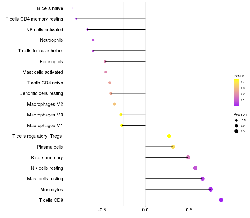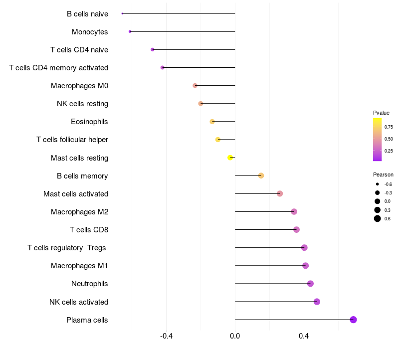Lollipop of CYSLTR2 expression and immune infiltrating cell level correlation result in HBV+ Liver cirrhosis samples