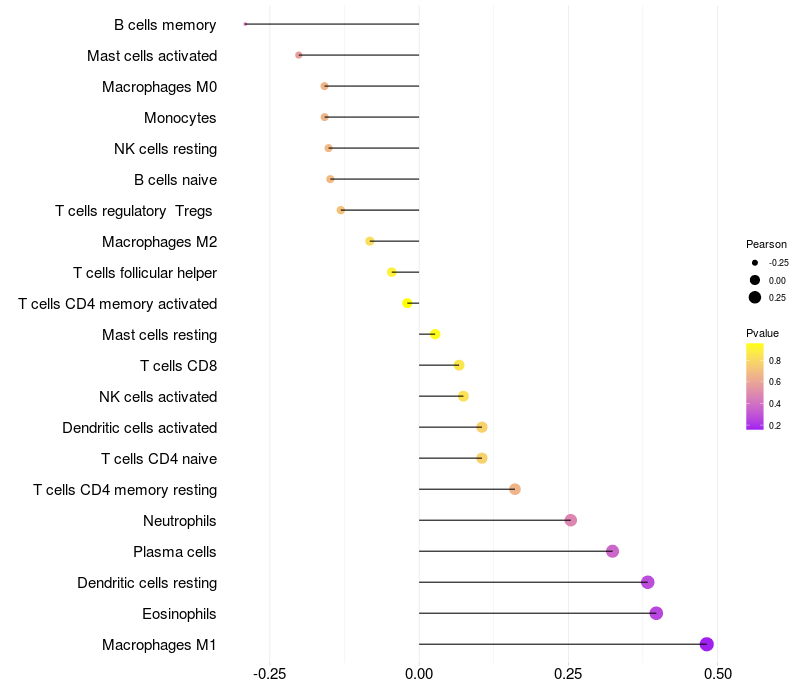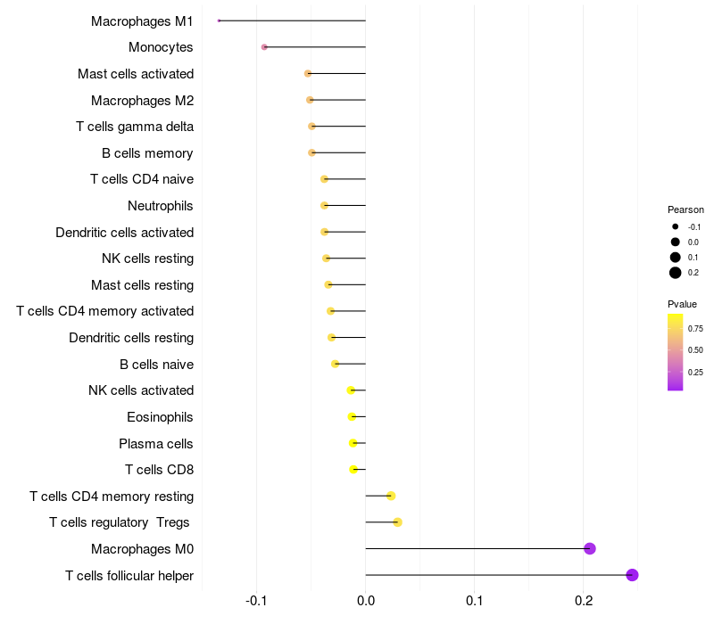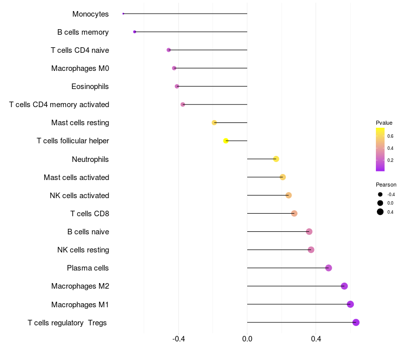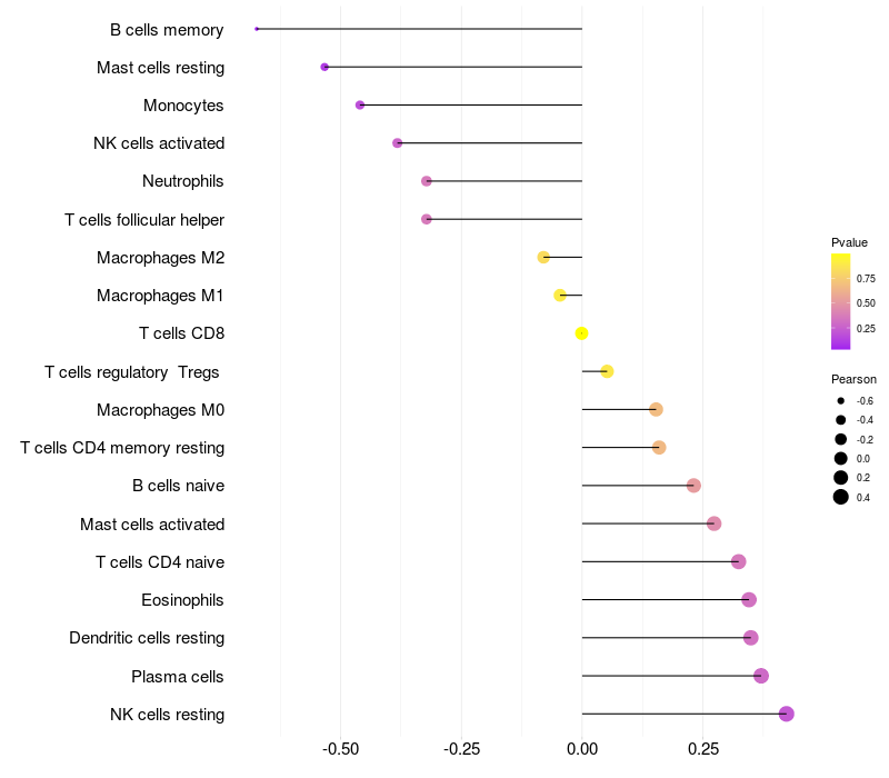 Lollipop of DACH2 expression and immune infiltrating cell level correlation result in HBV+ Liver cirrhosis samples