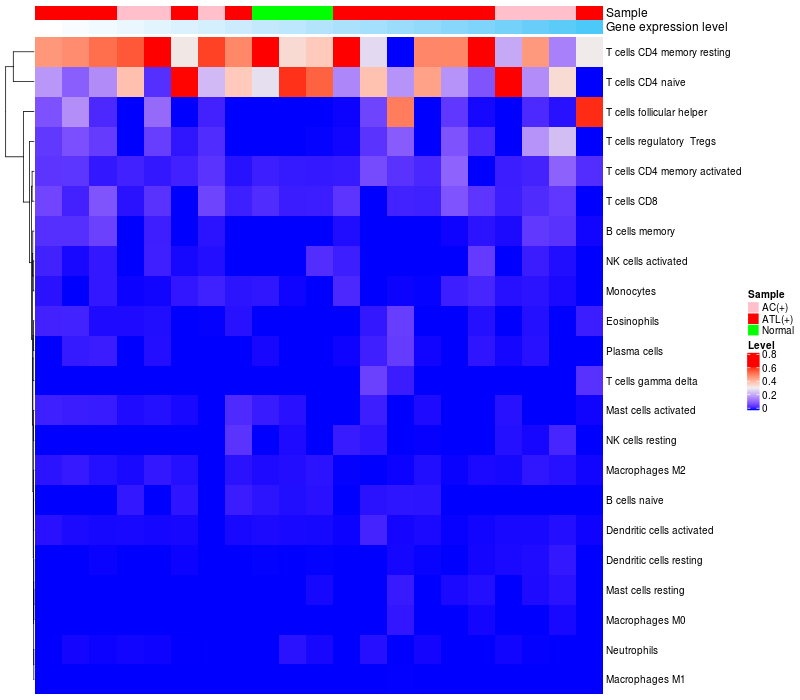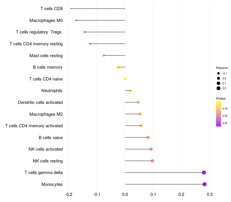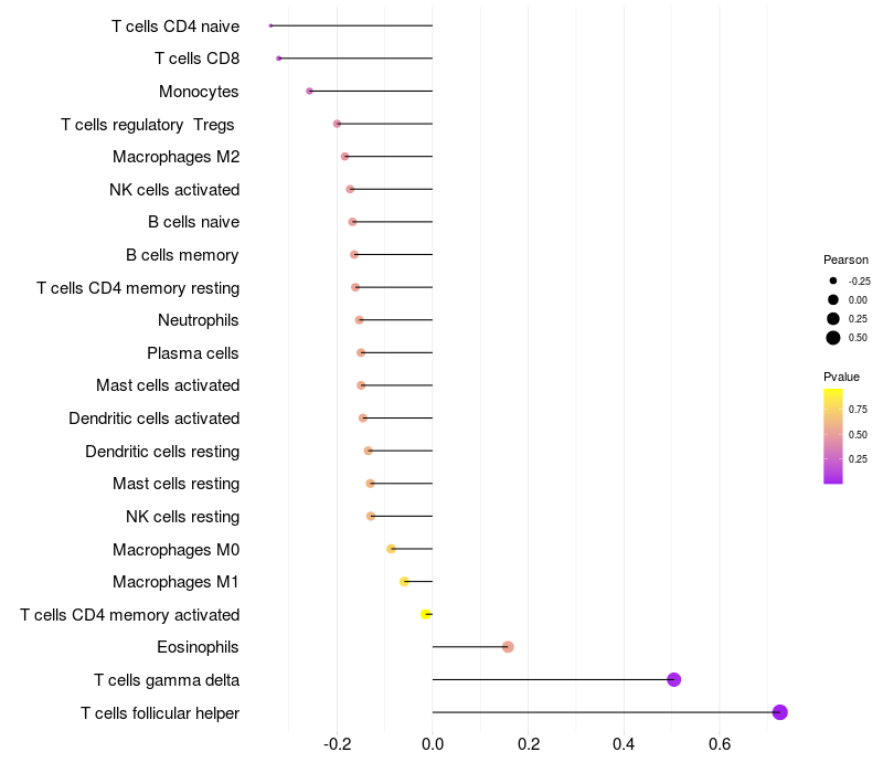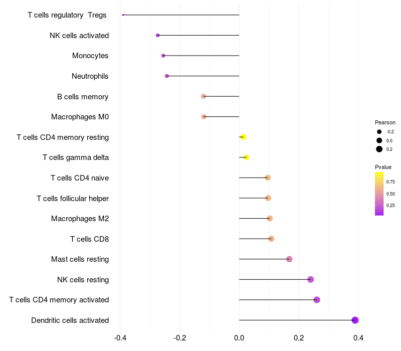 Lollipop of DACT2 expression and immune infiltrating cell level correlation result in HTLV1+ samples