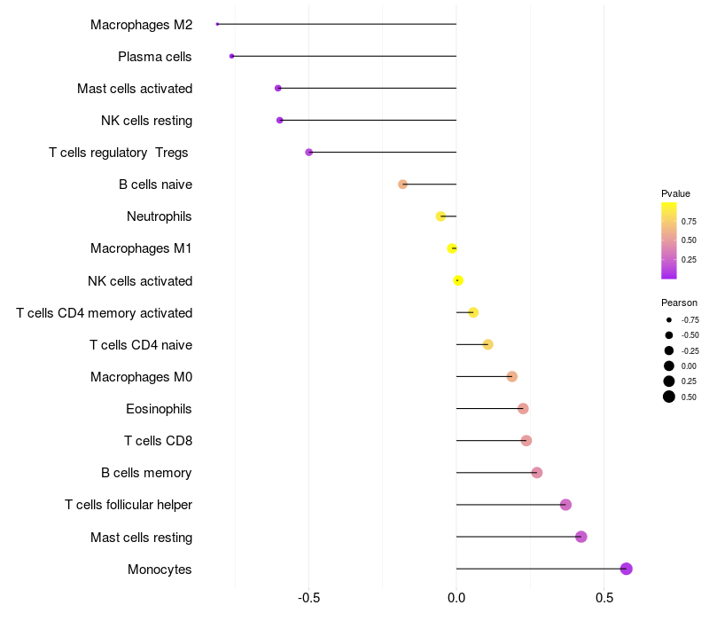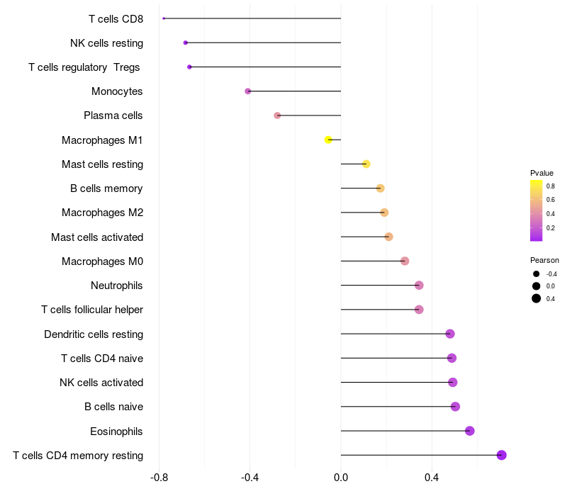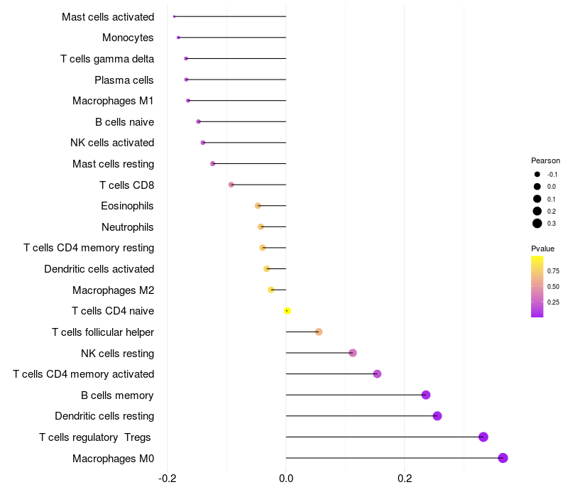 Lollipop of DAP3 expression and immune infiltrating cell level correlation result in HBV+ Liver cirrhosis samples